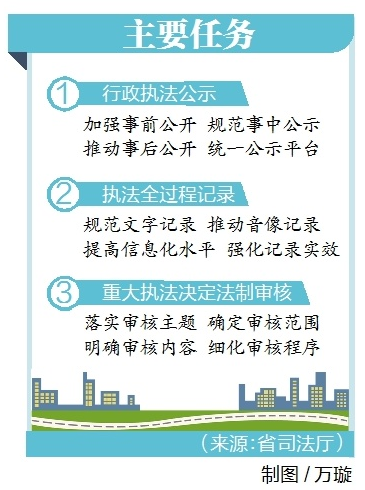 2020年3月底前,我省各级行政执法机关推行“三项制度”全面到位,目标是实现执法信息公开透明、执法全过程留痕、执法决定合法有效,经济社会发展的行政法治环境更加优良。(江卉、顾丹)