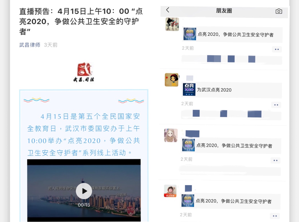 结合当前我区新冠肺炎疫情防控工作和经济社会发展工作实际,采用线上的方式制作并推送微信公众号图文,文章阅读量367次。一直以来,区司法局高度重视基层法治宣传教育,以56名司法人下沉隔离点和社区为契机,以点带面宣传疫情防控各项政策,制作“武昌司法人的责任与担当”及“武昌区司法局党员干部的战“疫”日记”等系列公众号文章,宣传正面抗疫英雄故事,让重大传染病防治、公共卫生安全教育深入人心。