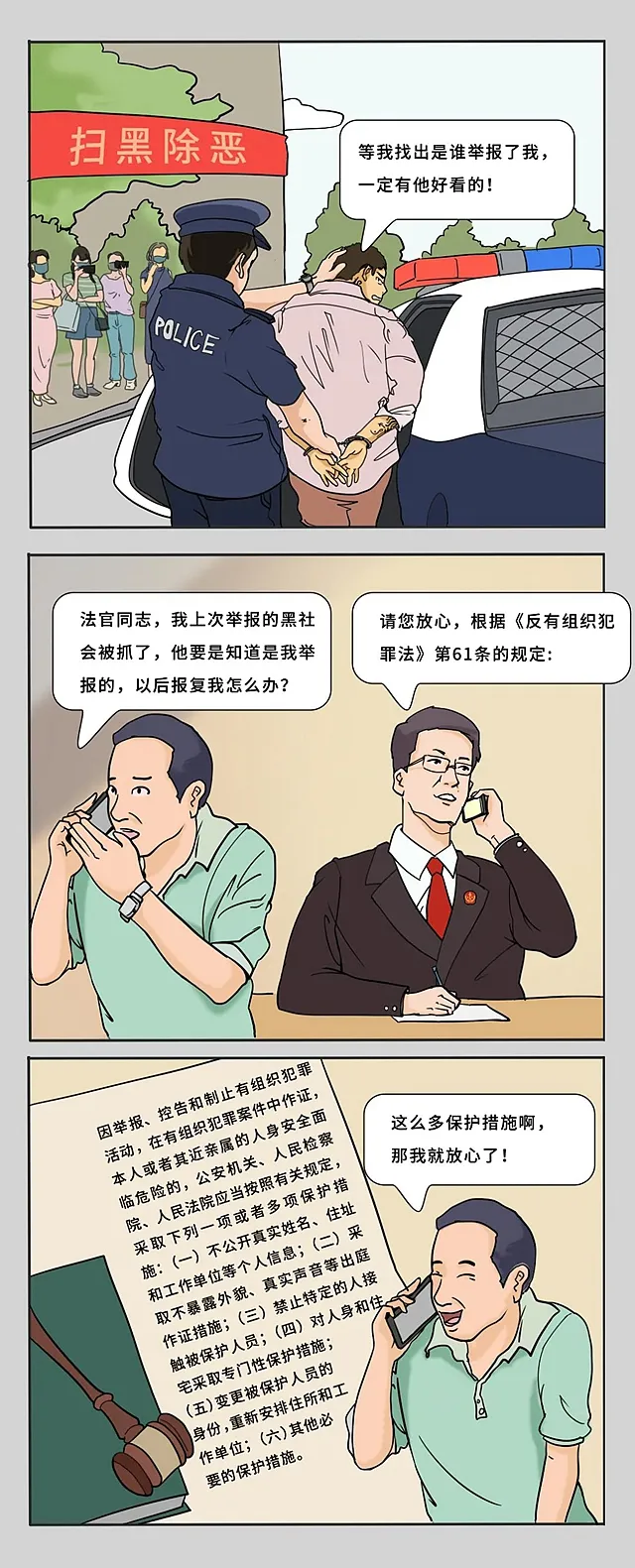 第六十一条:因举报、控告和制止有组织犯罪活动,在有组织犯罪案件中作证,本人或者其近亲属的人身安全面临危险的,公安机关、人民检察院、人民法院应当按照有关规定,采取下列一项或者多项保护措施:(一)不公开真实姓名、住址和工作单位等个人信息;(二)采取不暴露外貌、真实声音等出庭作证措施;(三)禁止特定的人接触被保护人员;(四)对人身和住宅采取专门性保护措施;(五)变更被保护人员的身份,重新安排住所和工作单位;(六)其他必要的保护措施。