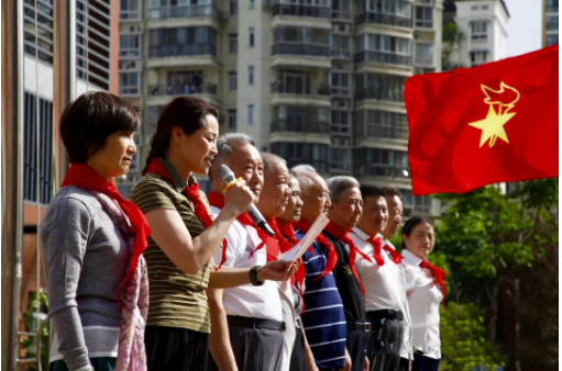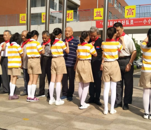 老兵们戴上红领巾敬献队礼的一刹那,脸上洋溢着青春的笑容。从他们脸上可以看出这种荣誉感的激动之情。重温入队誓词,整个校园回荡着铿锵有力的誓言,学生们从此在心中埋下爱党爱国的情怀。老兵们找到初心的激情。