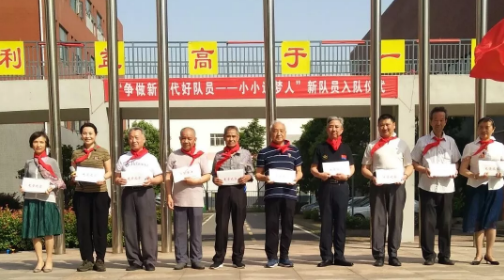 200多位一年级新生加入光荣的少先队仪式过后,十位退役老兵们迈着统一的步伐登上讲台,他们虽然大都60-70岁,但退伍不褪色,军人本色依然不减。少先队员们怀着最崇敬与感恩的心情,向老兵们佩戴红领巾并现场送上光荣牌。