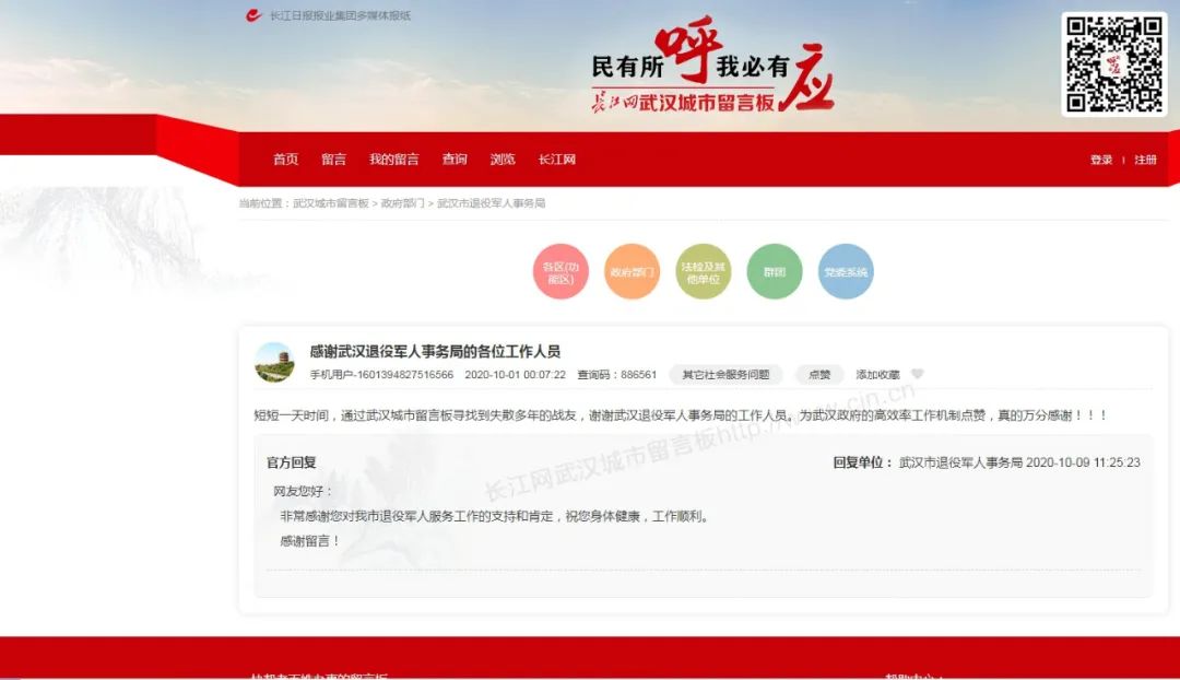 10月1日,国庆节第一天,罗佩专程向武汉市退役军人服务中心致电表示感谢,同时还在武汉城市留言板上留言。他写道:“短短一天时间,通过武汉城市留言板寻找到失散多年的战友,谢谢武汉市退役军人事务局的工作人员。为相关政府部门的高效率工作机制点赞,真的万分感谢。”