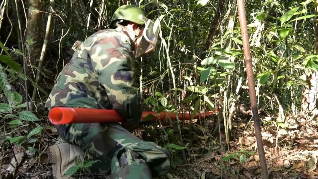雷区山高坡陡、草深林密、地势险峻,只能采取人工作业的方式,先爆破后用排雷器查排。雷场爆炸物种类多、密度大、埋设复杂、性能极不稳定,使扫雷过程异常危险。