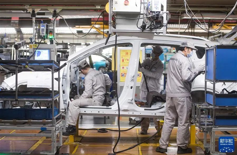 工人在湖北武汉东风乘用车公司工厂总装车间的流水线上作业(2020年3月24日摄)。新华社记者 肖艺九 摄