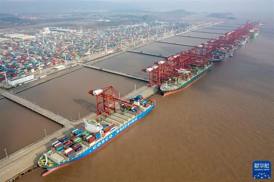 浙江宁波舟山港梅山港区集装箱码头一派繁忙(2021年12月17日摄,无人机照片)。新华社发(蒋晓东 摄)