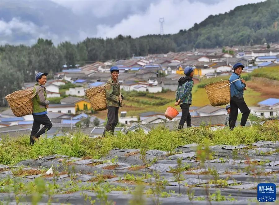 四川省凉山彝族自治州布拖县拖觉镇老吉村的妇女在去往蓝莓种植基地务工的路上(2020年8月13日摄)。新华社记者 刘坤 摄