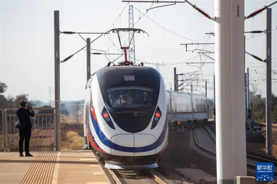 “澜沧号”动车组列车驶离老挝万象站(2021年12月3日摄)。新华社发(凯乔摄)