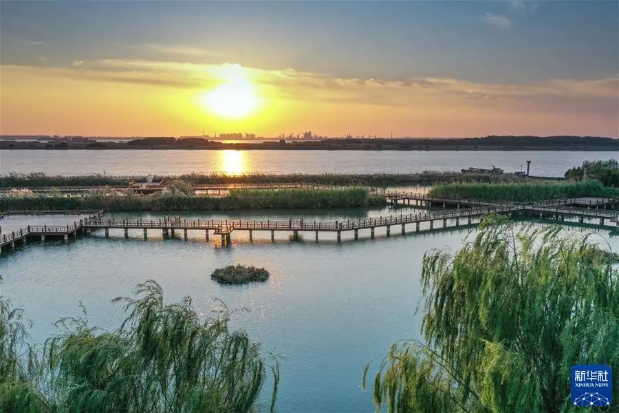 江苏泰兴市虹桥镇长江生态湿地风光带景色(2021年11月11日摄,无人机照片)。新华社记者 杨磊 摄