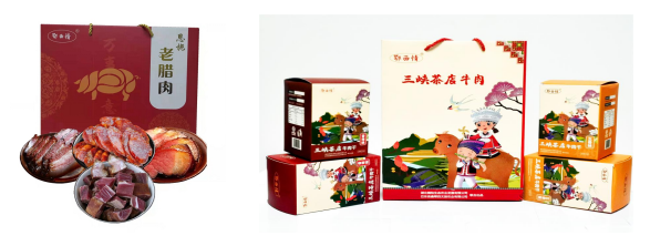 ▲公司产品:“鄂西情”黑猪老腊肉、“鄂西情”三峡茶店牛肉干