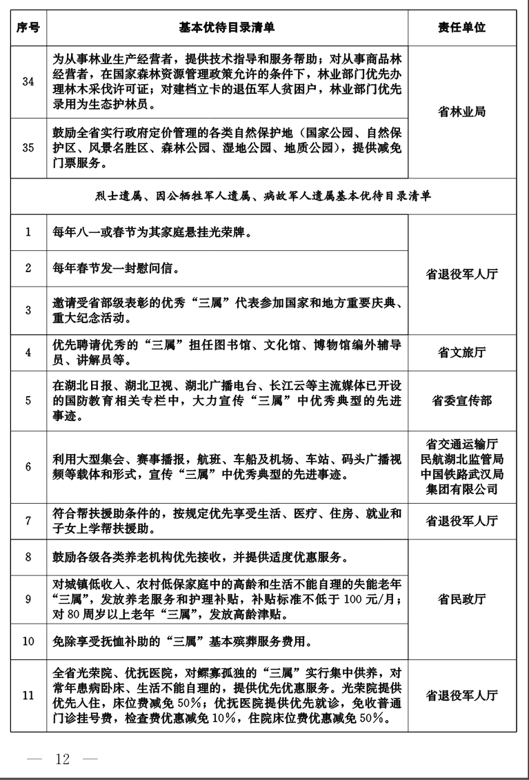 《湖北省军人军属、退役军人和其他优抚对象基本优待目录清单》
