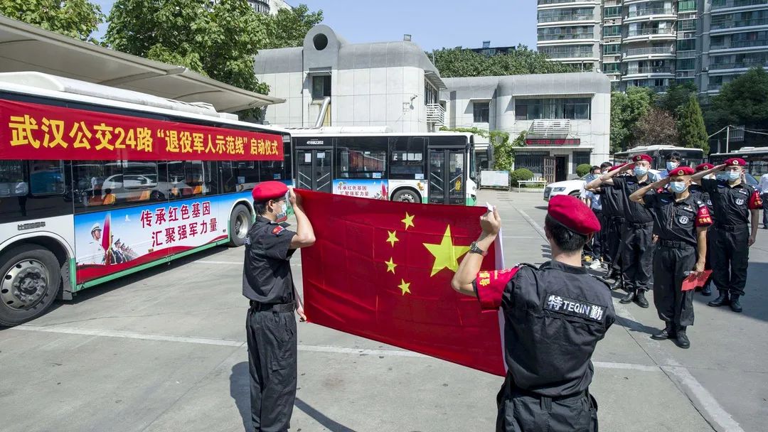 9月18日迎来第21个全民国防教育日,武汉公交24路开通“退役军人示范线”,2020年度“武汉楷模·最美退役军人”、24路头班车司机李旺富带领团队宣誓。