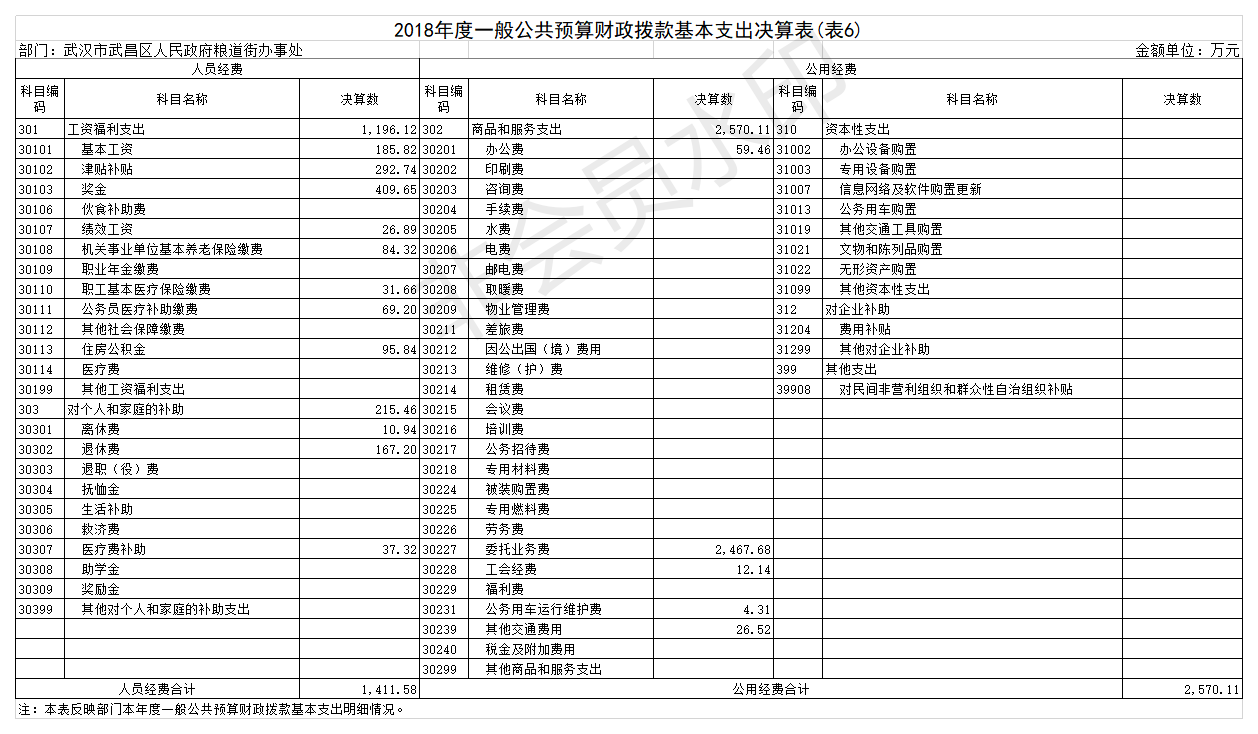 2018年度武汉市武昌区人民政府粮道街办事处(含参照公务员法管理的事业单位)机关运行经费支出2,570.11万元,比2017年增加287.82万元,增长12.61%。主要是新增人员的经费。