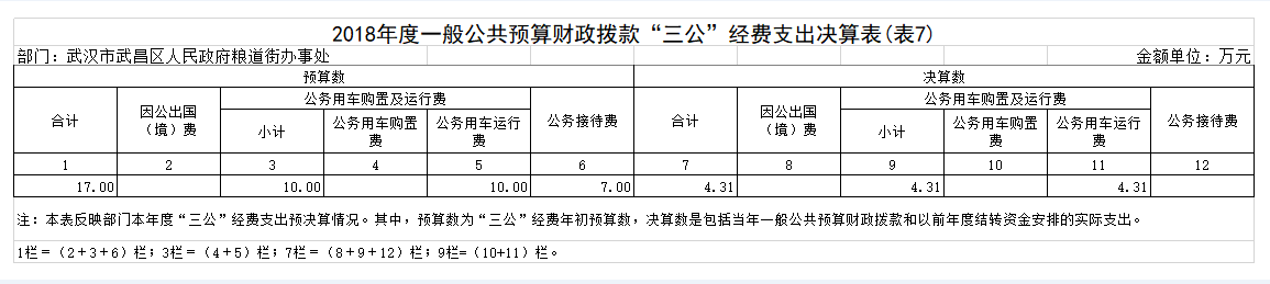 2018年武汉市武昌区人民政府粮道街办事处执行公务和开展业务活动开支公务接待费0万元。2018年度“三公”经费财政拨款支出决算数比2017年减少5.26万元。其中:因公出国(境)减少0.00万元、公务用车购置及运行费支出决算减少5.26万元,、公务接待支出减少0.00万元,公务用车购置及运行费支出决算减少的原因一是城管执法车的运行费用2017年列入公务车运行费用。二是加强了公务车管理和使用。