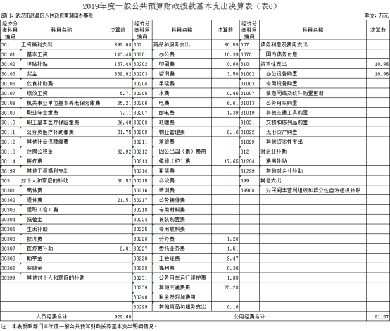 2019度一般公共预算财政拨款基本支出1,021.17万元,其中,人员经费929.60万元,主要包括:基本工资、津贴补贴、奖金、伙食补助费、绩效工资、机关事业单位基本养老保险缴费、职业年金缴费、职工基本医疗保险缴费、公务员医疗补助缴费、其他社会保障缴费、住房公积金、医疗费、其他工资福利支出、离休费、退休费、退职(役)费、抚恤金、生活补助、救济费、医疗费补助、助学金、奖励金、其他对个人和家庭的补助;公用经费91.57万元,主要包括:办公费、印刷费、咨询费、手续费、水费、电费、邮电费、取暖费、物业管理费、差旅费、因公出国(境)费用、维修(护)费、租赁费、会议费、培训费、公务接待费、专用材料费、被装购置费、专用燃料费、劳务费、委托业务费、工会经费、福利费、公务用车运行维护费、其他交通费用、税金及附加费用、其他商品和服务支出、国内债务付息、办公设备购置、专用设备购置、信息网络及软件购置更新、公务用车购置、其他交通工具购置、文物和陈列品购置、无形资产购置、其他资本性支出、费用补贴、其他对企业补助、对民间非营利组织和群众性自治组织补贴。