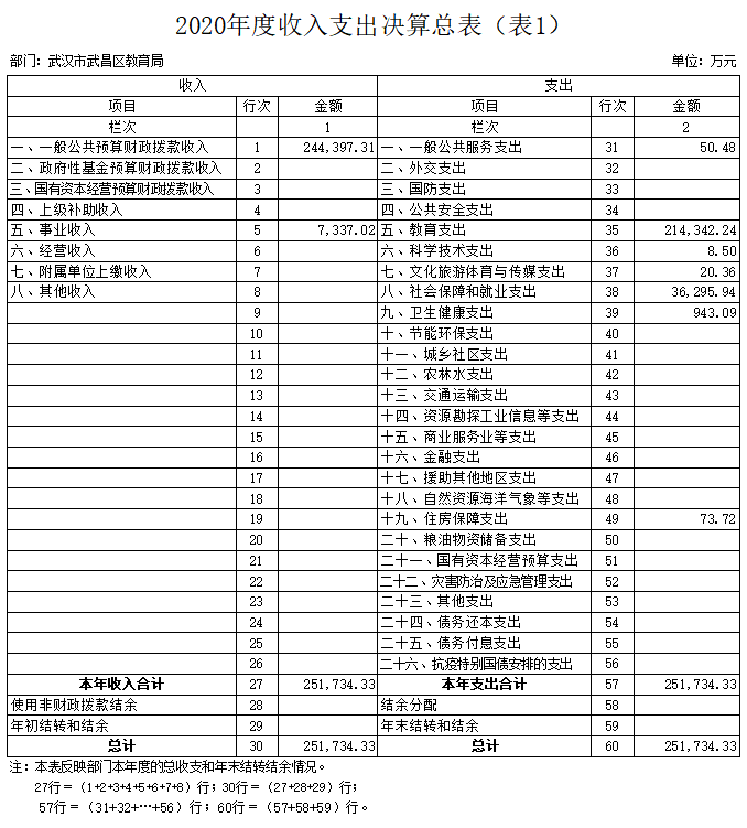 2020年度收、支总计251,734.33万元。与2019年度相比,收、支总计各减少71,783.71万元,下降22.19%,主要原因是2019年有湖北省武昌实验中学改扩建项目一次性支付76,000万元,剔除一次性建设经费,增长2%。