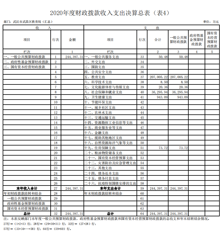 2020年度财政拨款收、支总计244,397.31万元。与2019年度相比,财政拨款收、支总计各减少75,105.02万元,下降23.51%。主要原因是2019年有湖北省武昌实验中学改扩建项目一次性支付76,000万元,剔除一次性建设经费,增长2%。