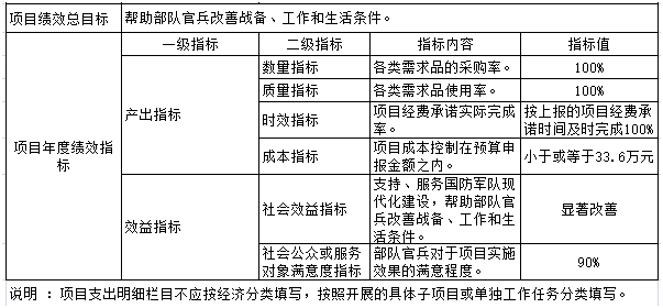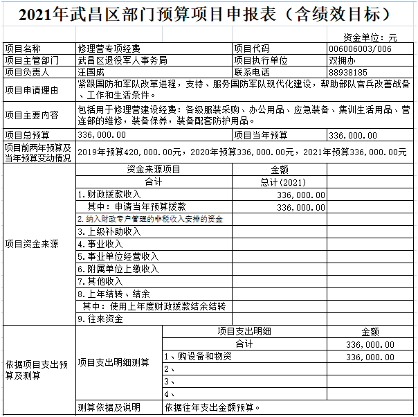 6、修理营专项经费33.60万元。主要是用于用于湖北陆军预备役高炮师修理营购买修理设备、训练器材、办公文体用品、服装以及部队营房建设支出;