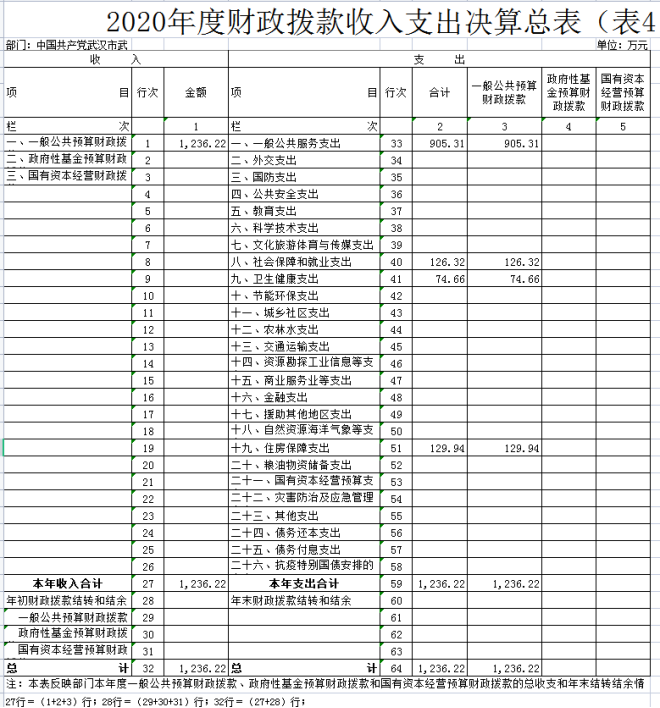 2020年度收、支总计1,236.22万元。与2019年度相比,收、支总计各增加194.31万元,增长18.65%,主要原因是人员异动、职务变动、职级晋升等正常增资。