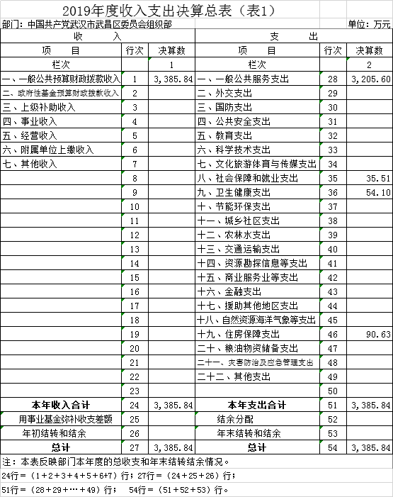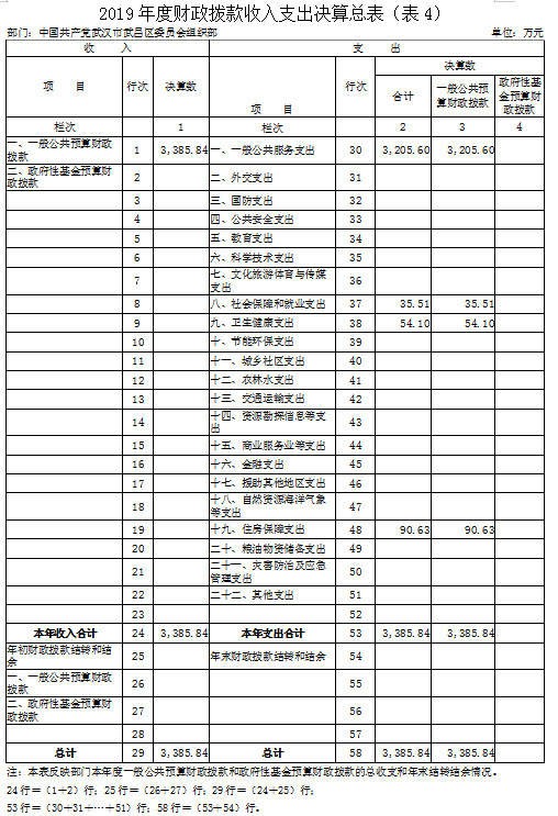 2019年度收、支总计3,385.84万元。与2018年相比,收、支总计各增加 11.12万元,增长 0.33%,主要原因是全区党员基数增大,党员教育经费增加;两新组织党建活动增加,经费保障增加;机构改革后公务员局并入,公务员招录、管理等相关经费增加。