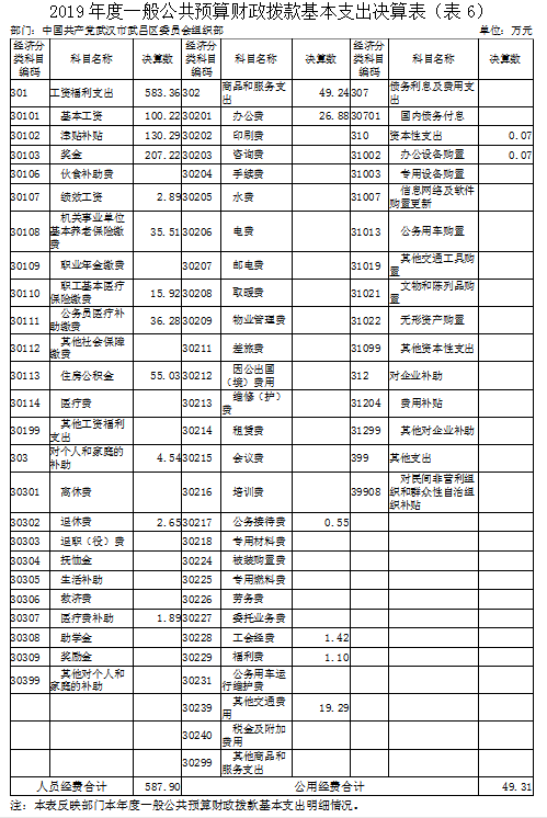 2019度一般公共预算财政拨款基本支出637.21万元,其中,人员经费587.90万元,主要包括:基本工资、津贴补贴、奖金、伙食补助费、绩效工资、机关事业单位基本养老保险缴费、职业年金缴费、职工基本医疗保险缴费、公务员医疗补助缴费、其他社会保障缴费、住房公积金、医疗费、其他工资福利支出、离休费、退休费、退职(役)费、抚恤金、生活补助、救济费、医疗费补助、助学金、奖励金、其他对个人和家庭的补助;公用经费49.31万元,主要包括:办公费、印刷费、咨询费、手续费、水费、电费、邮电费、取暖费、物业管理费、差旅费、因公出国(境)费用、维修(护)费、租赁费、会议费、培训费、公务接待费、专用材料费、被装购置费、专用燃料费、劳务费、委托业务费、工会经费、福利费、公务用车运行维护费、其他交通费用、税金及附加费用、其他商品和服务支出、国内债务付息、办公设备购置、专用设备购置、信息网络及软件购置更新、公务用车购置、其他交通工具购置、文物和陈列品购置、无形资产购置、其他资本性支出、费用补贴、其他对企业补助、对民间非营利组织和群众性自治组织补贴。