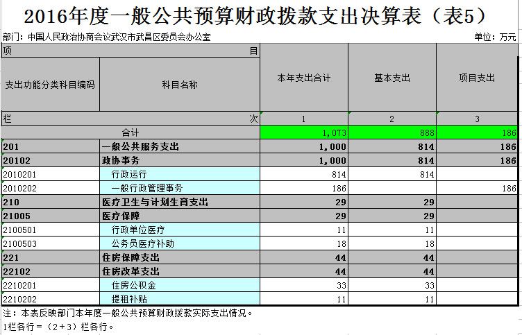 2016年一般公共预算财政拨款支出年度预算为1073万元(包括年初部门预算、基本建设等专项资金、上级下达的专项转移支付资金及年初结转和结余资金等),支出决算为1073万元,完成年度预算的100%。其中:基本支出888万元,项目支出186万元。项目支出主要用于1.工作经费72.7万元,主要成效:举办委员培训班、政协常委学习资料、委员学习资料、文史资料、调研课题、5个专委会经费。项目名称2.界别活动经费16.1万元,主要成效:拨5个专委会界别委员经费。项目名称3.委员视察活动经费17.0万元,主要成效:用于组织委员视察、调研、民主监督小组活动经费、专题视察经费。项目名称4.界别街道联络委活动经费2.1万,主要成效:用于28个界别活动经费、14条街道联络委工作经费。项目名称5.专家论坛经费9.0万,主要成效:用于全年组织开展质量水平较高的专家论坛课题调研等活动。项目名称6.政协全委会专项经费59.8万,主要成效:用于参加会议的政协委员用餐、优秀委员表彰、优秀提案表彰、大会优秀发言表彰、列席委员及工作人员用餐、交通及生活补贴、借调人员补贴、大会物品购置、后勤保障、电子签到等费用。项目名称7.第五轮“三万活动”经费1万,用于支持对口帮扶单位基本建设。项目名称8.换届经费,用于政协委员考察、证件制作、材料印制等。
