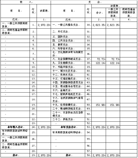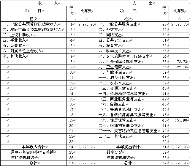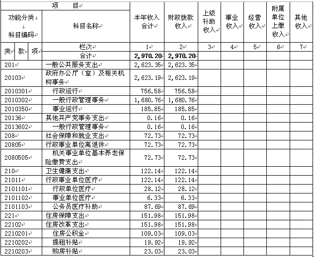 2019年度收、支总计2,970.20万元。与2018年相比,收、支总计各增加128.30万元,增长4.51%,主要原因是新招录工作人员和接收军转干部、因工作需要增加综合整治经费等。