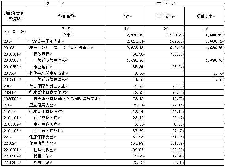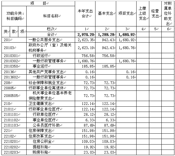 2019年度财政拨款支出2,970.20万元,主要用于以下方面:一般公共服务(类)支出2,623.35万元,占88.32%;国防(类)支出0.00万元,占0.00%;公共安全(类)支出0.00万元,占0.00%;教育(类)支出0.00万元,占0.00%;科学技术(类)支出0.00万元,占0.00%;文化旅游体育与传媒(类)支出0.00万元,占0.00%;社会保障和就业(类)支出72.73万元,占2.45%;卫生健康(类)支出122.14万元,占4.11%;节能环保(类)支出0.00万元,占0.00%;城乡社区(类)支出0.00万元,占0.00%;农林水(类)支出0.00万元,占0.00%;交通运输(类)支出0.00万元,占0.00%;资源勘探信息等(类)支出0.00万元,占0.00%;商业服务业等(类)支出0.00万元,占0.00%;金融(类)支出0.00万元,占0.00%;援助其他地区(类)支出0.00万元,占0.00%;自然资源海洋气象等(类)支出0.00万元,占0.00%;住房保障(类)支出151.98万元,占5.12%;粮油物资储备(类)支出0.00万元,占0.00%;灾害防治及应急管理(类)支出0.00万元,占0.00%;其他(类)支出0.00万元,占0.00%。