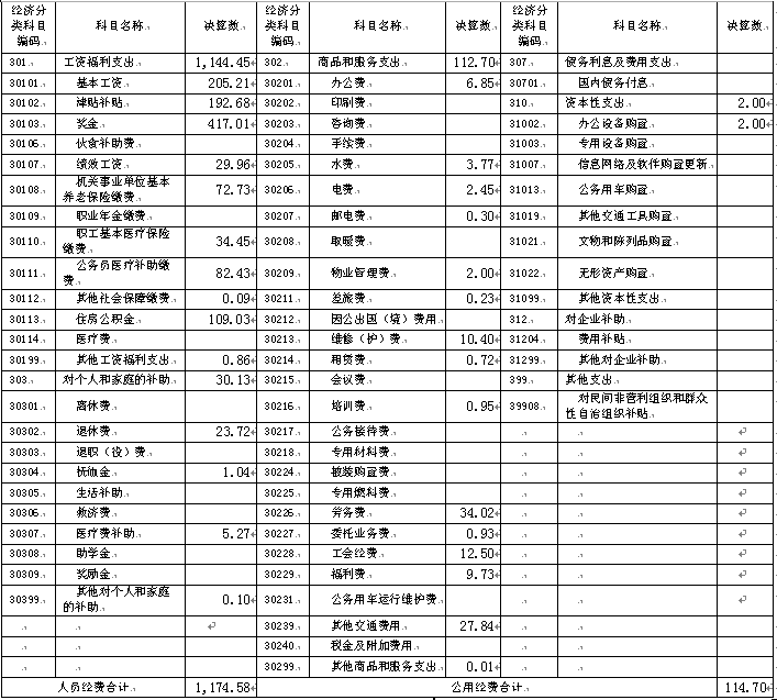 2019度一般公共预算财政拨款基本支出1,289.28万元,其中,人员经费1,174.59万元,主要包括:基本工资、津贴补贴、奖金、伙食补助费、绩效工资、机关事业单位基本养老保险缴费、职业年金缴费、职工基本医疗保险缴费、公务员医疗补助缴费、其他社会保障缴费、住房公积金、医疗费、其他工资福利支出、离休费、退休费、退职(役)费、抚恤金、生活补助、救济费、医疗费补助、助学金、奖励金、其他对个人和家庭的补助;公用经费114.72万元,主要包括:办公费、印刷费、咨询费、手续费、水费、电费、邮电费、取暖费、物业管理费、差旅费、因公出国(境)费用、维修(护)费、租赁费、会议费、培训费、公务接待费、专用材料费、被装购置费、专用燃料费、劳务费、委托业务费、工会经费、福利费、公务用车运行维护费、其他交通费用、税金及附加费用、其他商品和服务支出、国内债务付息、办公设备购置、专用设备购置、信息网络及软件购置更新、公务用车购置、其他交通工具购置、文物和陈列品购置、无形资产购置、其他资本性支出、费用补贴、其他对企业补助、对民间非营利组织和群众性自治组织补贴。(只说明本部门主要使用科目)