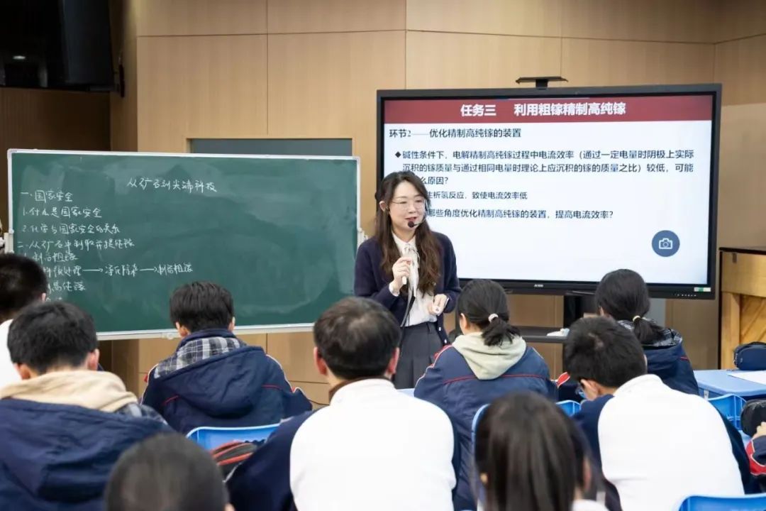 “工程师”们热情高涨,利用所学知识设计出了两套不同路径的制备方案。“这两种方案,哪一种更好?”李慧敏的提问又引起一阵热烈的讨论,同学们最终选定了其中一种。李慧敏继续引导:“这个方案中,我们还可以从哪些角度优化精制高纯镓装置,以提高电流效率?”方案一步步得到优化。“各位‘工程师’真是太棒了!你们知道吗?我国镓产量占全球产量的90%以上,自主掌握精制高纯镓的技术,可以保障半导体产业的稳定发展。”李慧敏总结道,“希望同学们学好化学,以化学之力捍卫国家安全。”