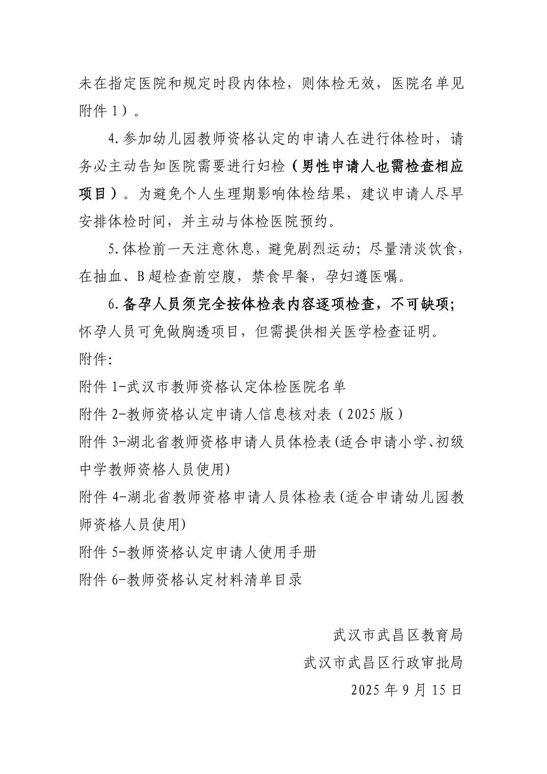 附件1-武汉市教师资格认定体检医院名单.pdf 附件2-教师资格认定申请人信息核对表(2025版).doc 附件3-湖北省教师资格申请人员体检表(适合申请中小学教师资格人员使用).doc 附件4-湖北省教师资格申请人员体检表(适合申请幼儿园教师资格人员使用).doc 附件6-教师资格认定材料清单目录.docx 附件5-教师资格认定申请人使用手册.pdf