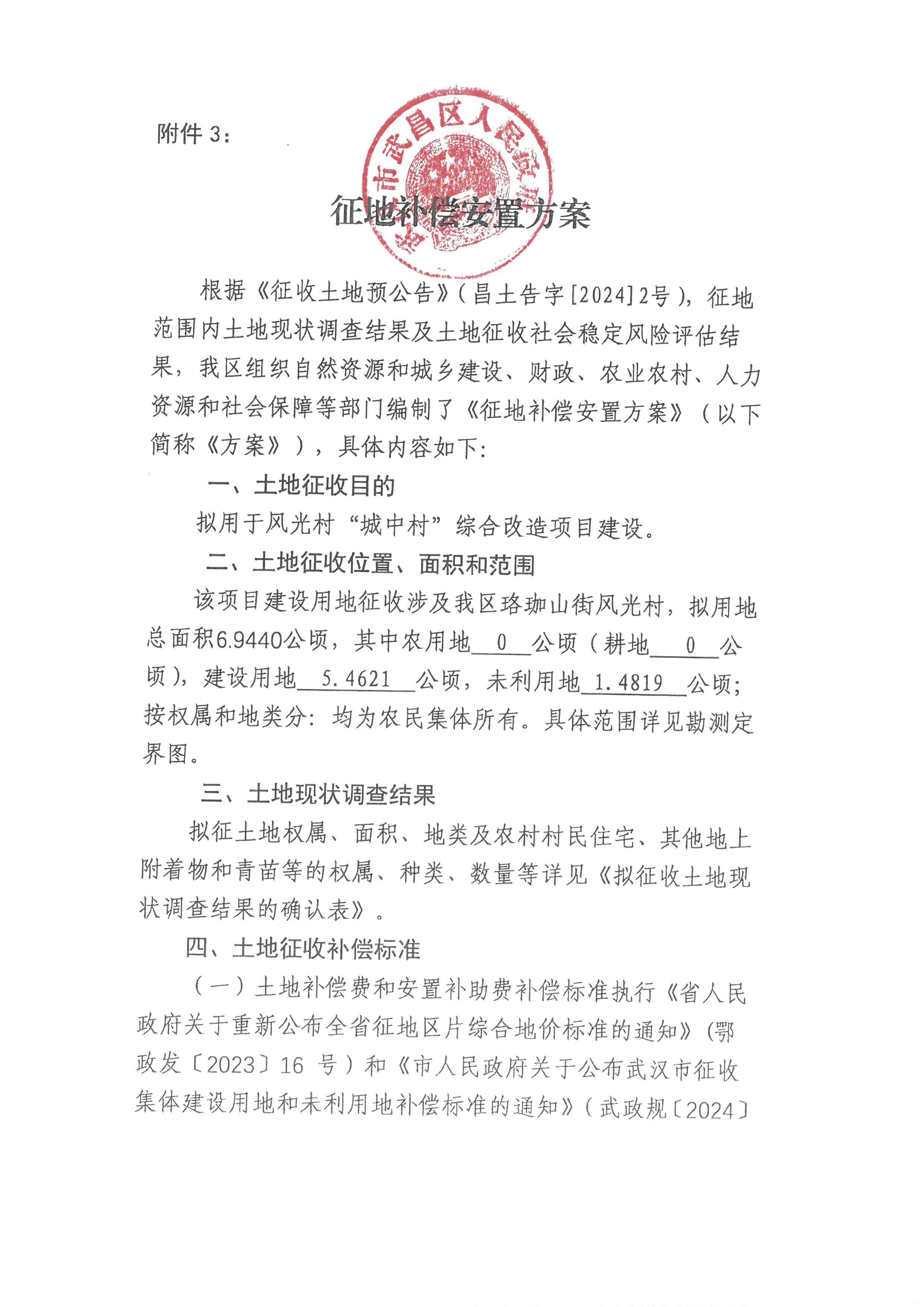 根据《中华人民共和国土地管理法》《中华人民共和国土地管理法实施条例》等法律法规和有关政策规定,结合风光村“城中村”综合改造项目土地征收预公告(昌土告字[2024]2号),武昌区人民政府对拟征收土地的土地现状、被征地农民参加养老保险情况和社会稳定性风险评估情况进行了调查,组织编制了征地补偿安置方案,拟对珞珈山街风光村农民集体土地进行征收。现将风光村“城中村”综合改造项目建设用地征地补偿安置方案内容和有关事项公告如下: