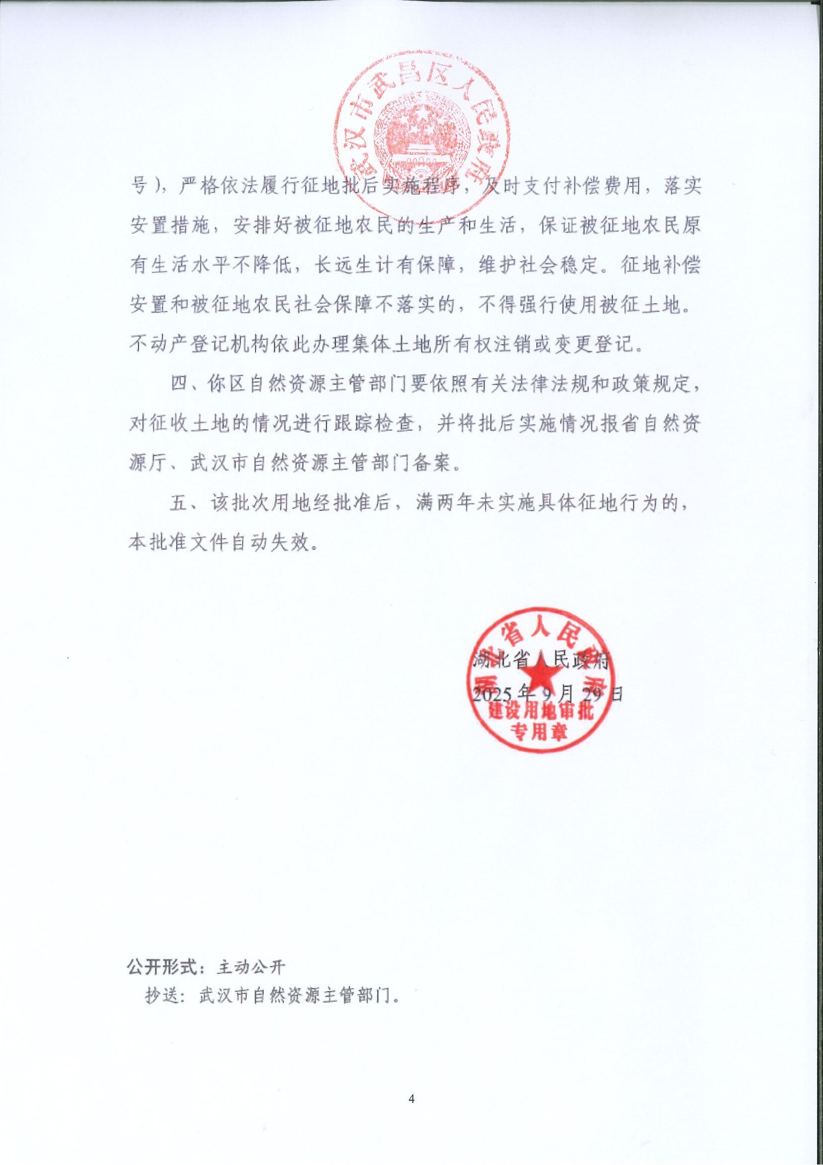 根据《省人民政府关于武汉市武昌区2025年度第1批次城市建设用地(沙湖环湖路南段<新生路泵站-沙湖南环路>工程)的批复》(鄂政土批〔2025〕1202号)文件,湖北省(武汉市)人民政府已经批准同意武昌区人民政府对下列集体土地办理征收和农用地转用手续。现将有关事项公告如下: