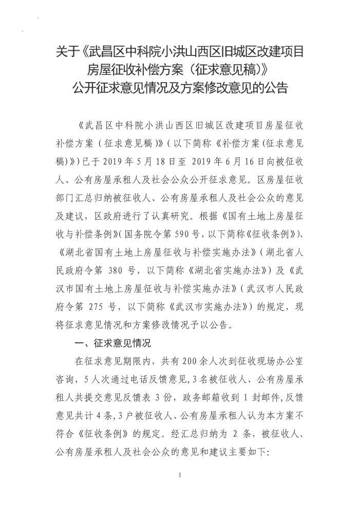 关于《武昌区中科院小洪山西区旧城区改建项目房屋征收补偿方案(征求意见稿)》公开征求意见情况及方案修改意见的公告