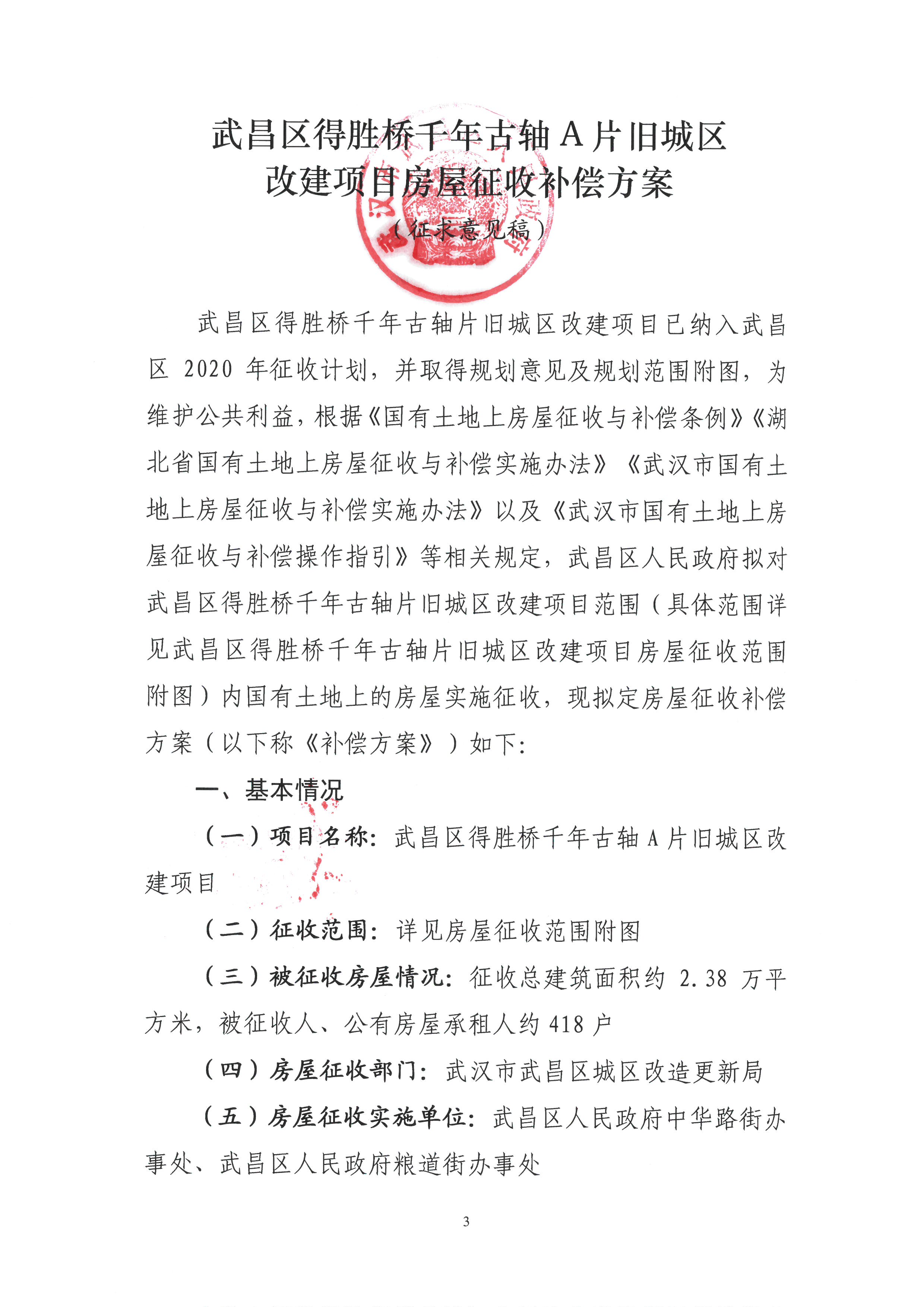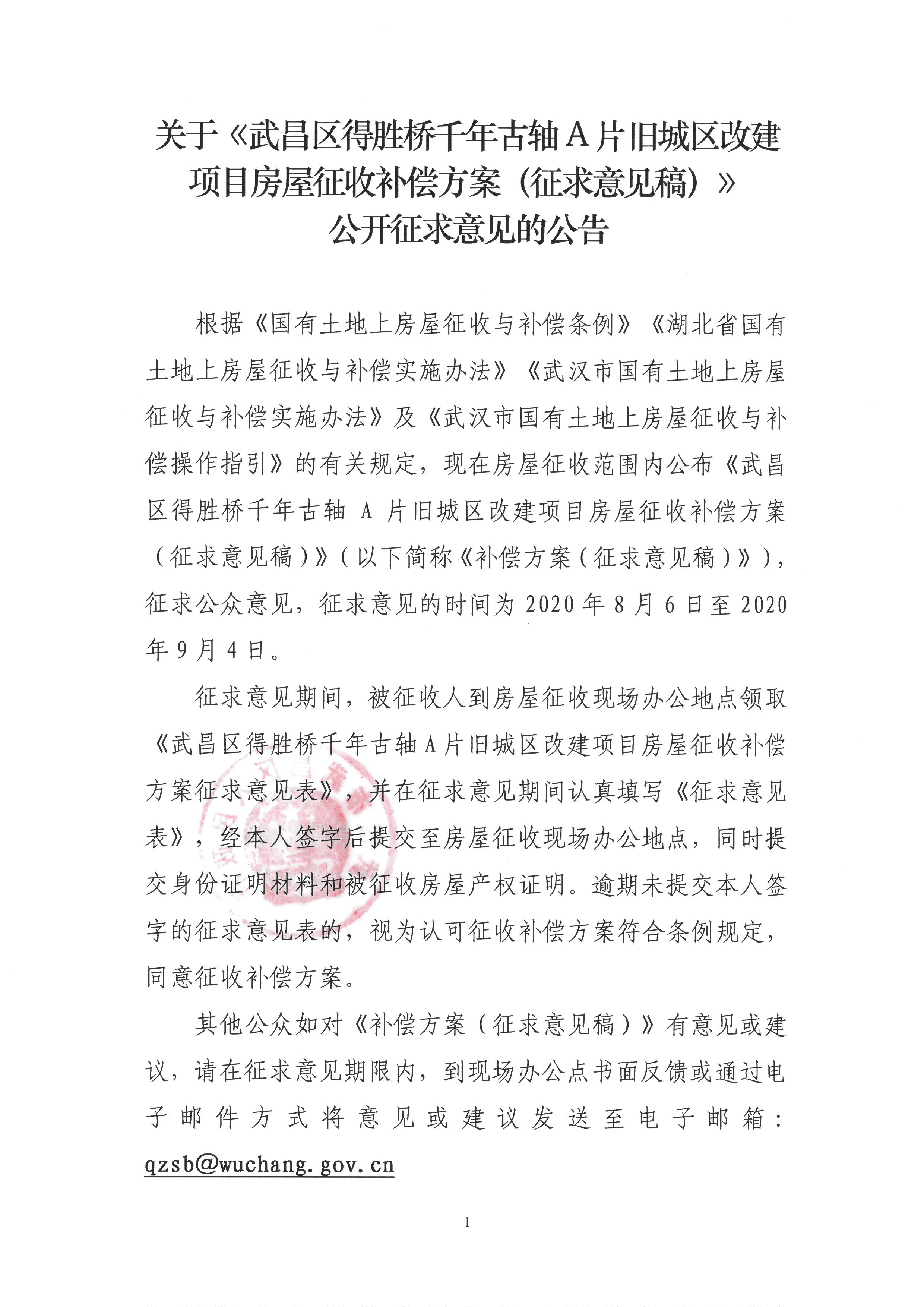 关于《武昌区得胜桥千年古轴A片旧城区改建项目房屋征收补偿方案(征求意见稿)》公开征求意见的公告