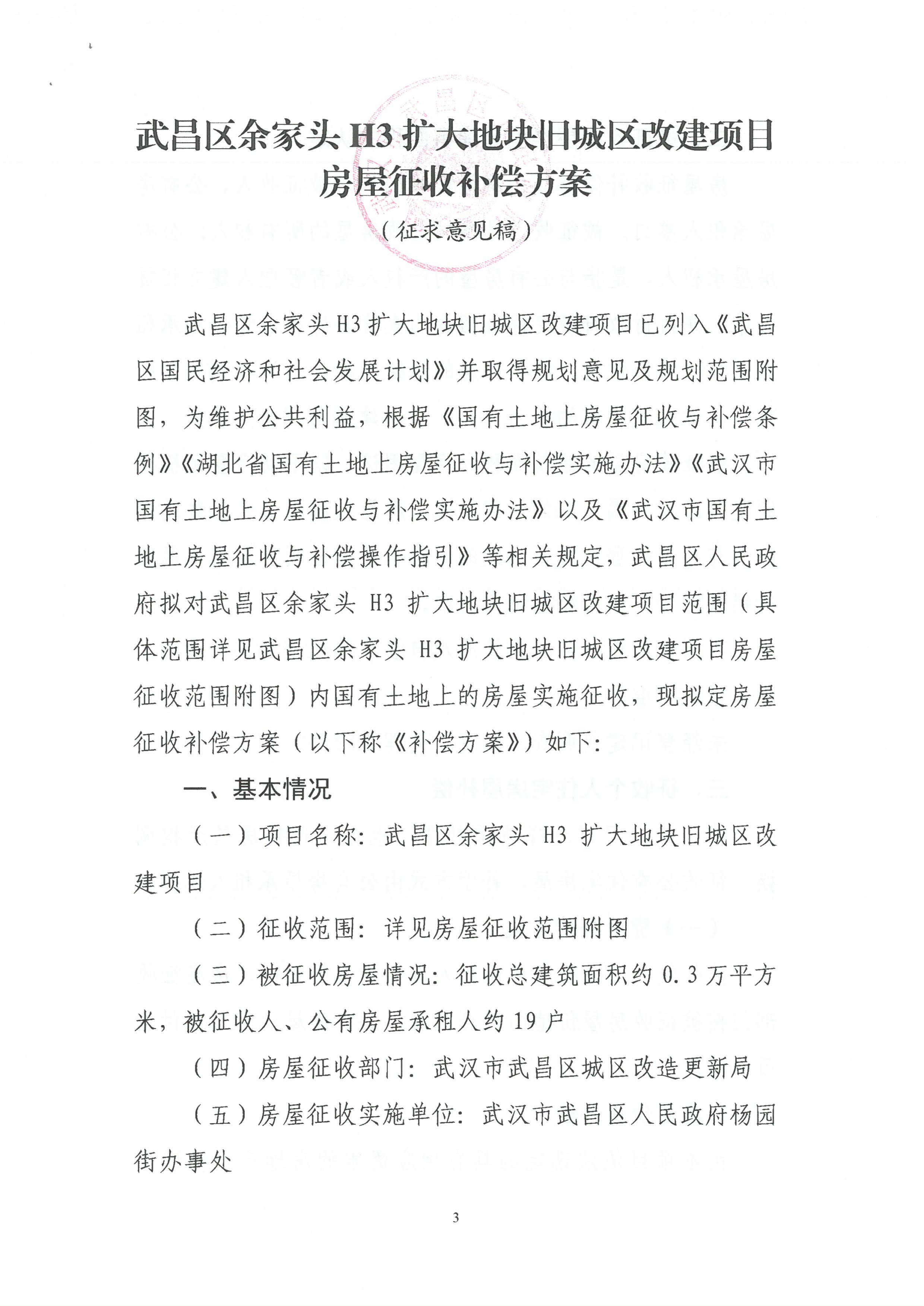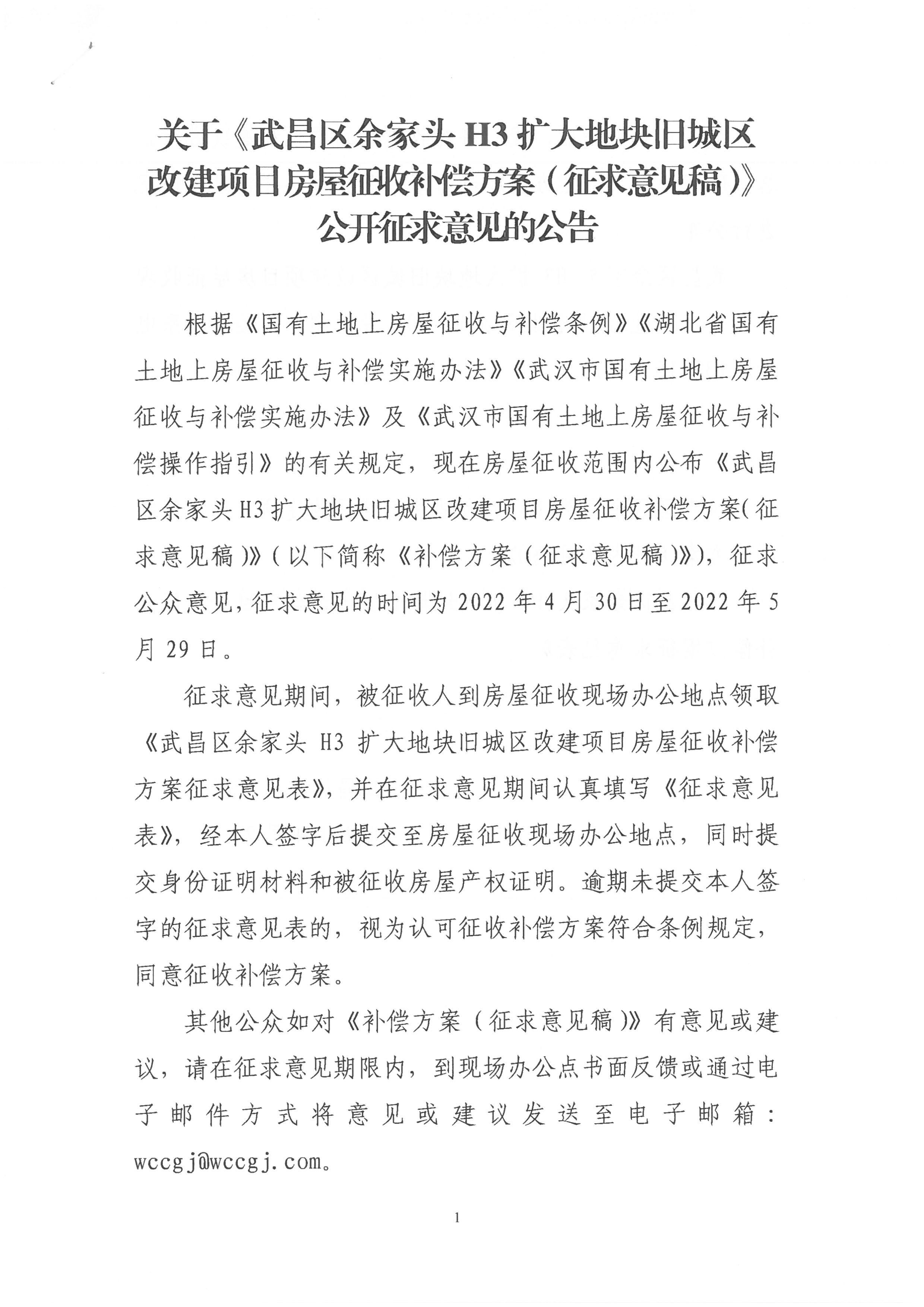 关于《武昌区余家头H3扩大地块项目房屋征收补偿方案(征求意见稿)》公开征求意见的公告