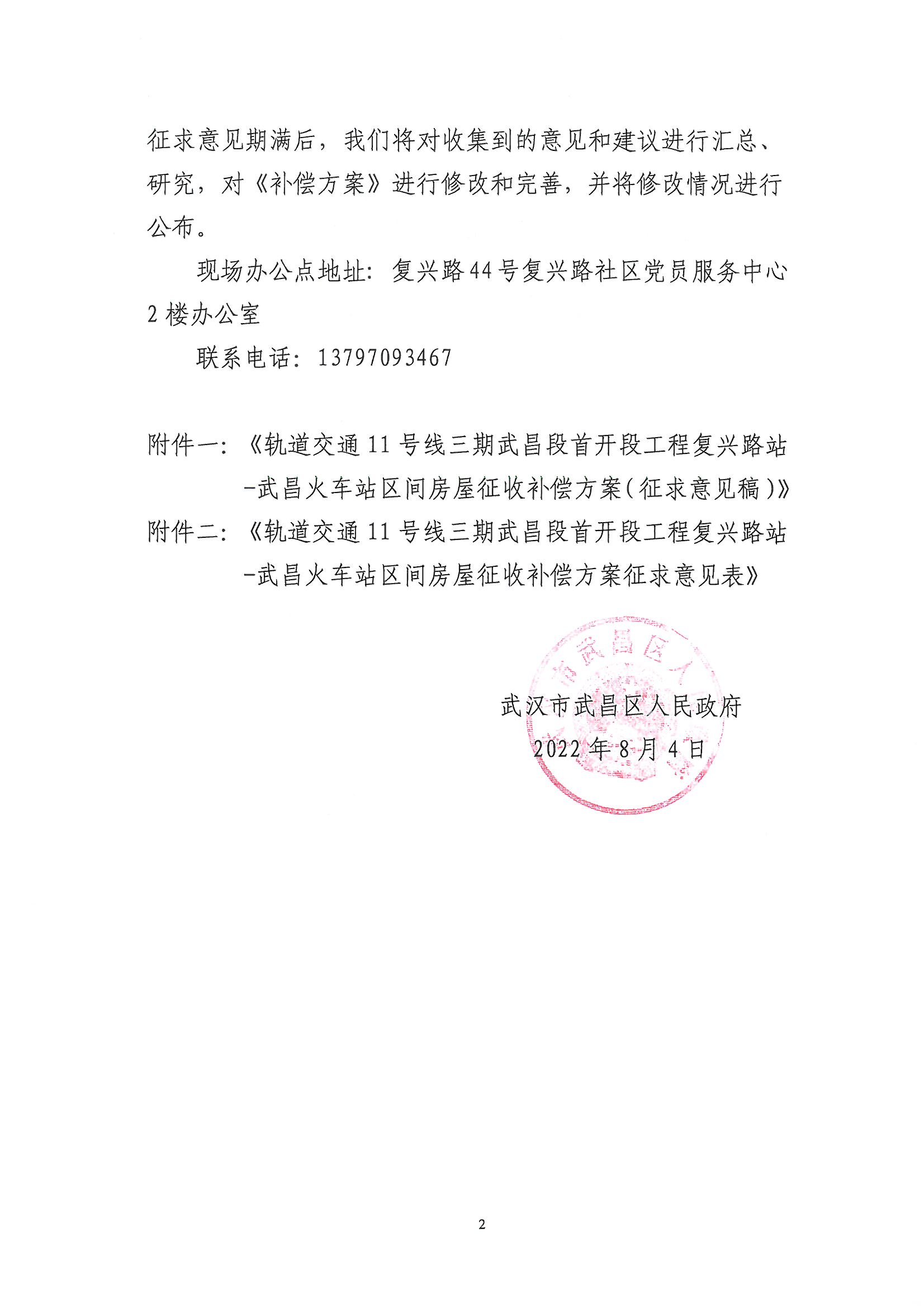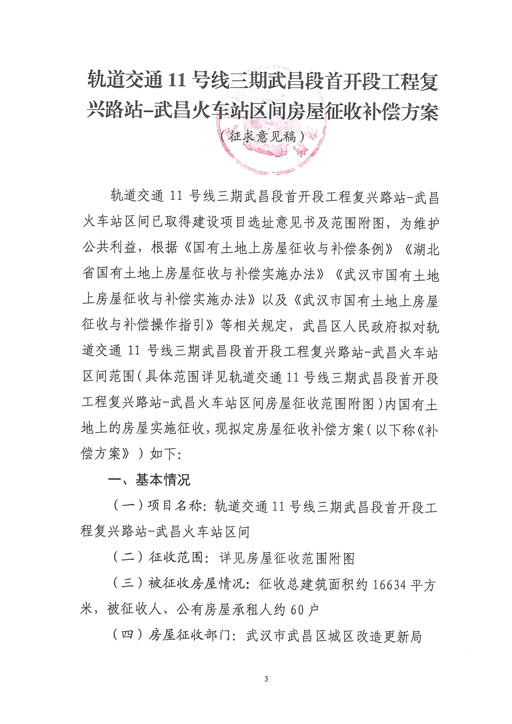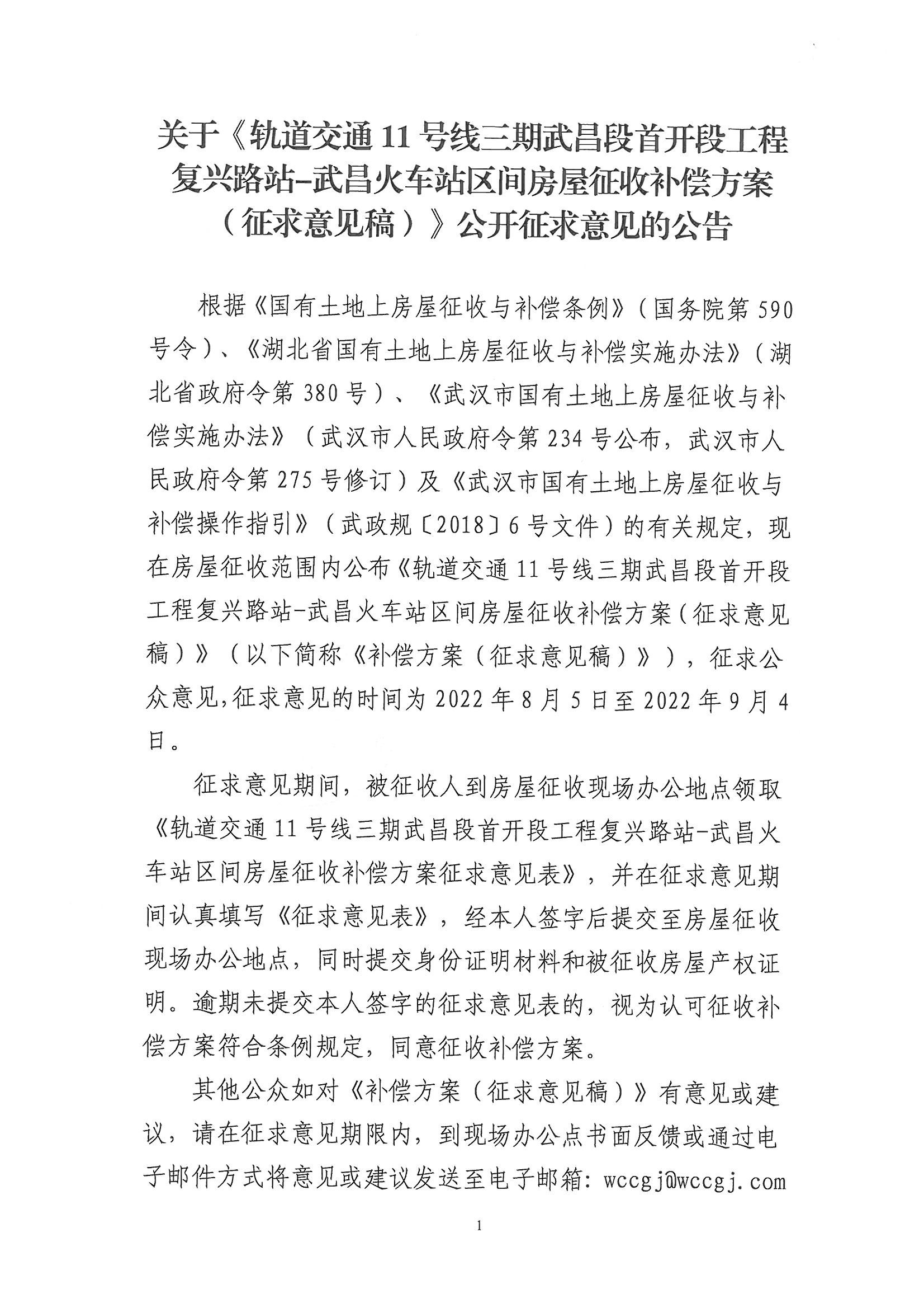 关于《轨道交通11号线三期武昌段首开段工程复兴路站-武昌火车站区间房屋征收补偿方案(征求意见稿)》公开征求意见的公告