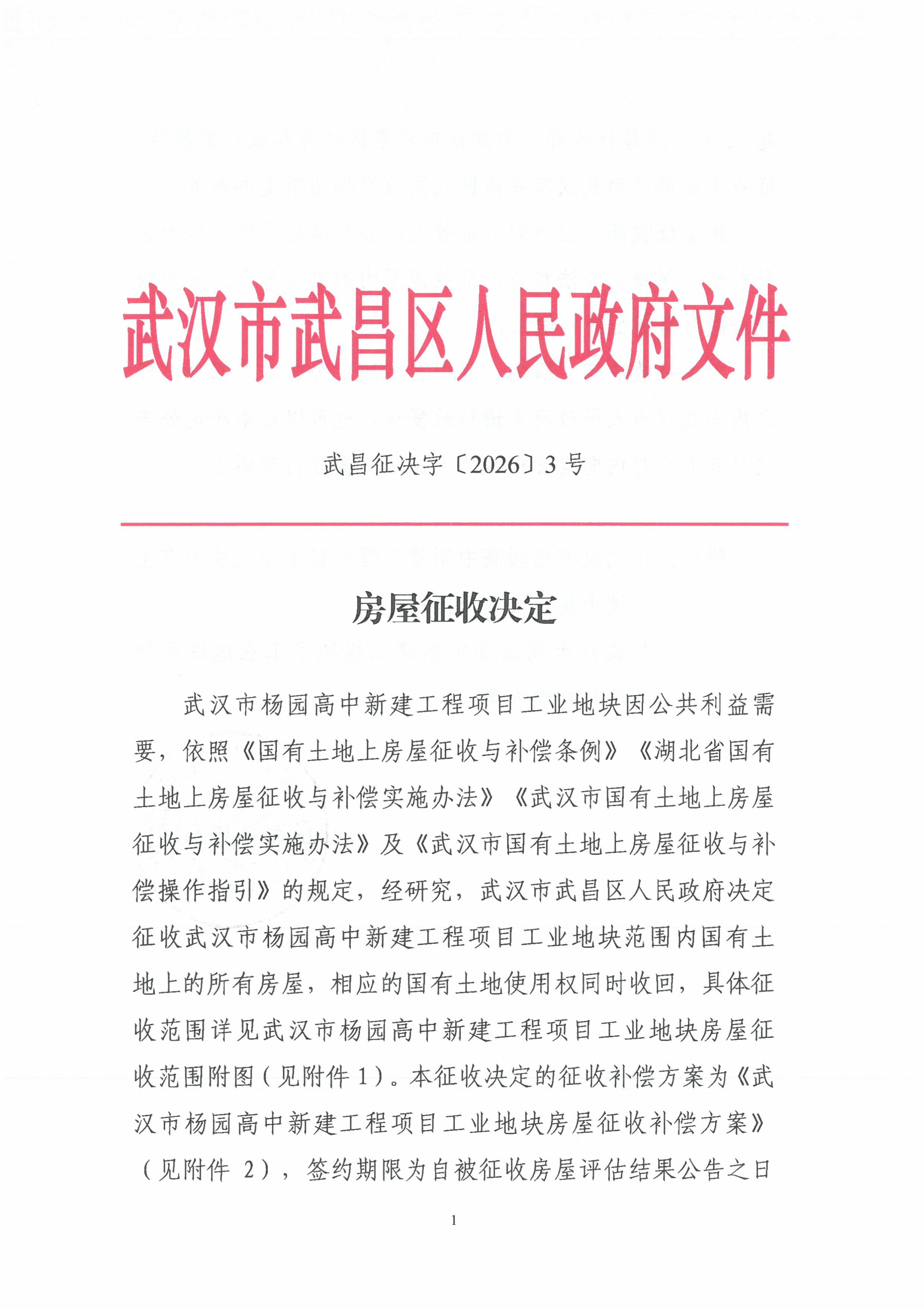 房屋征收决定(武汉市杨园高中新建工程项目工业地块)