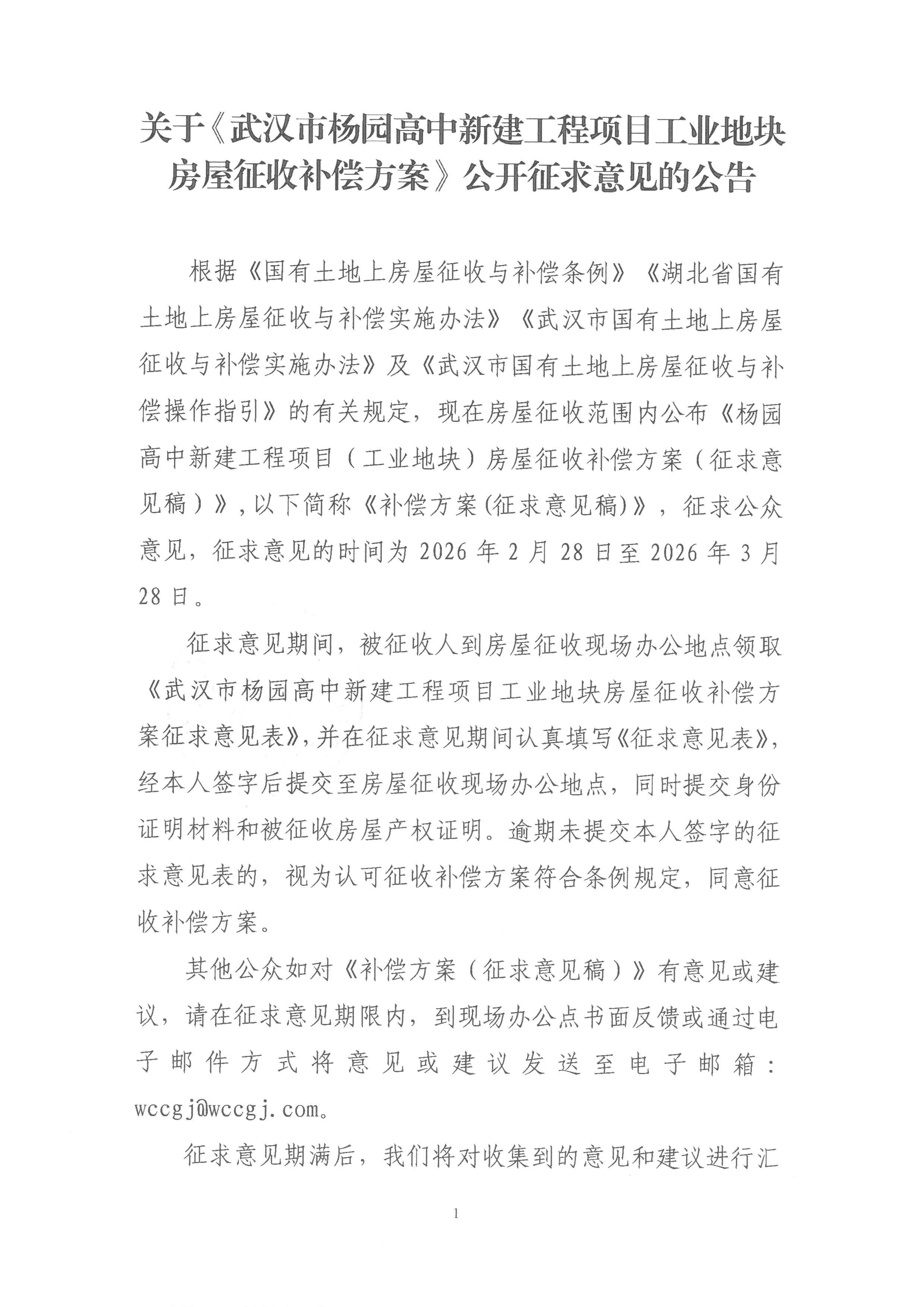 关于《武汉市杨园高中新建工程项目工业地块房屋征收补偿方案》公开征求意见的公告