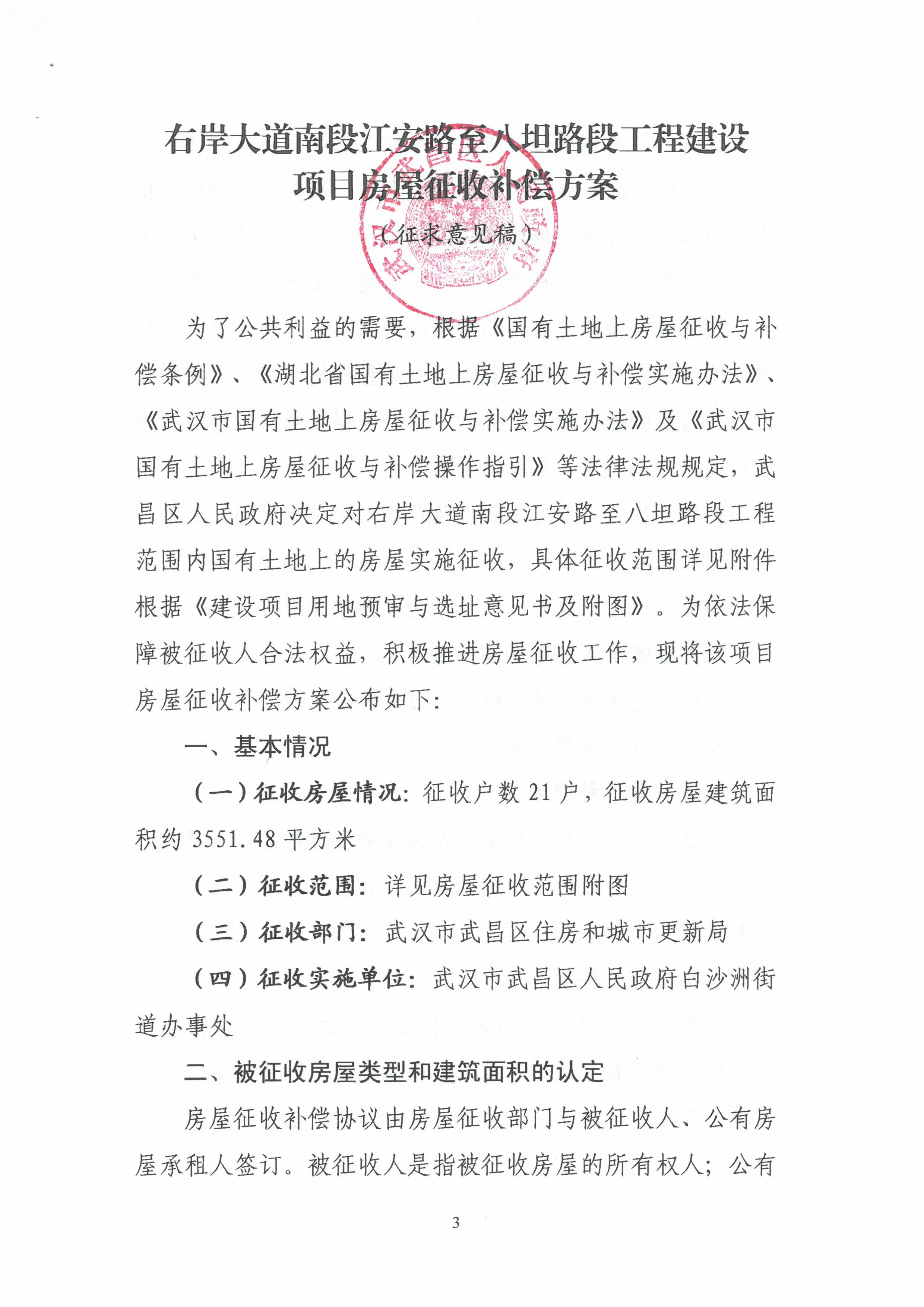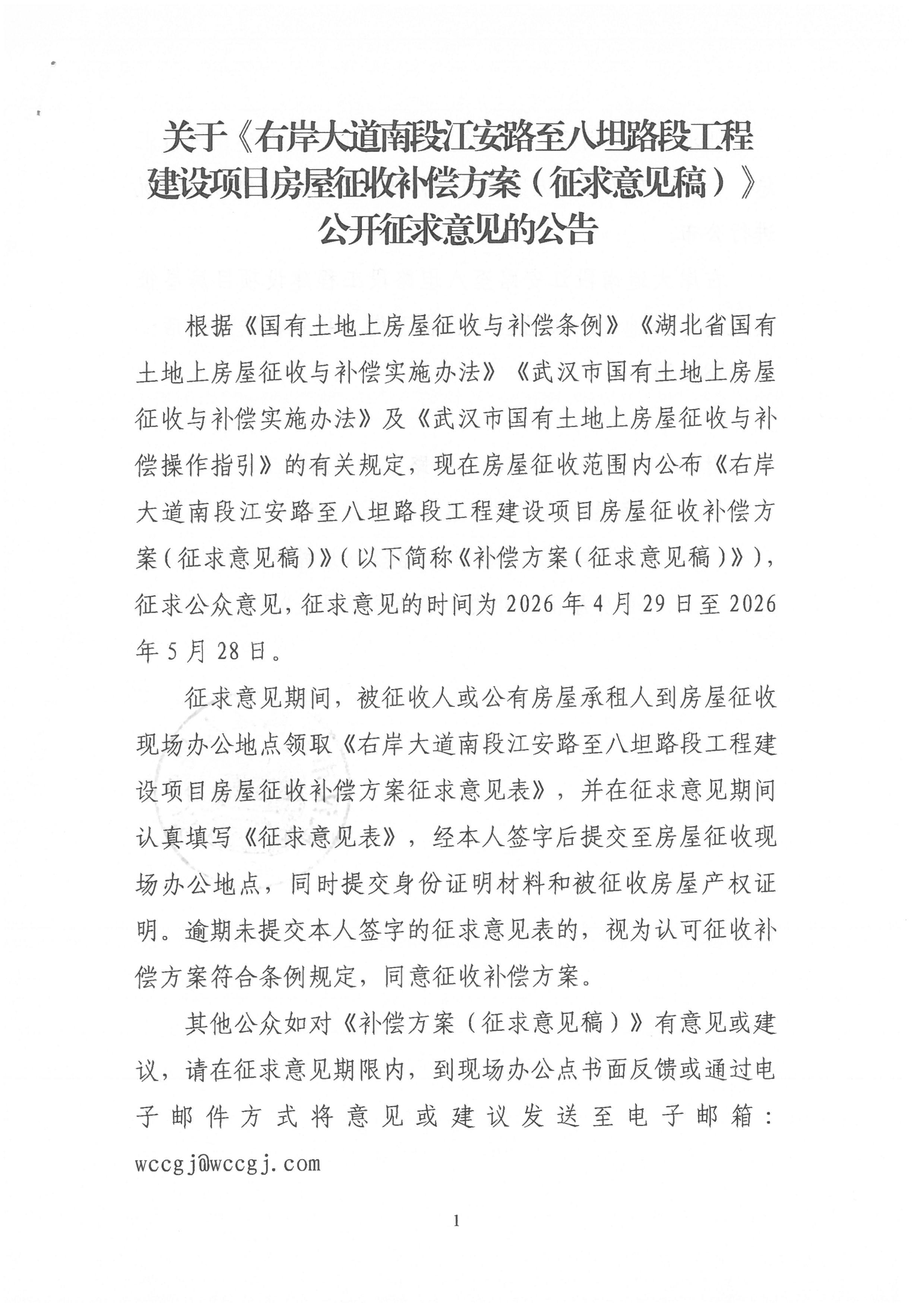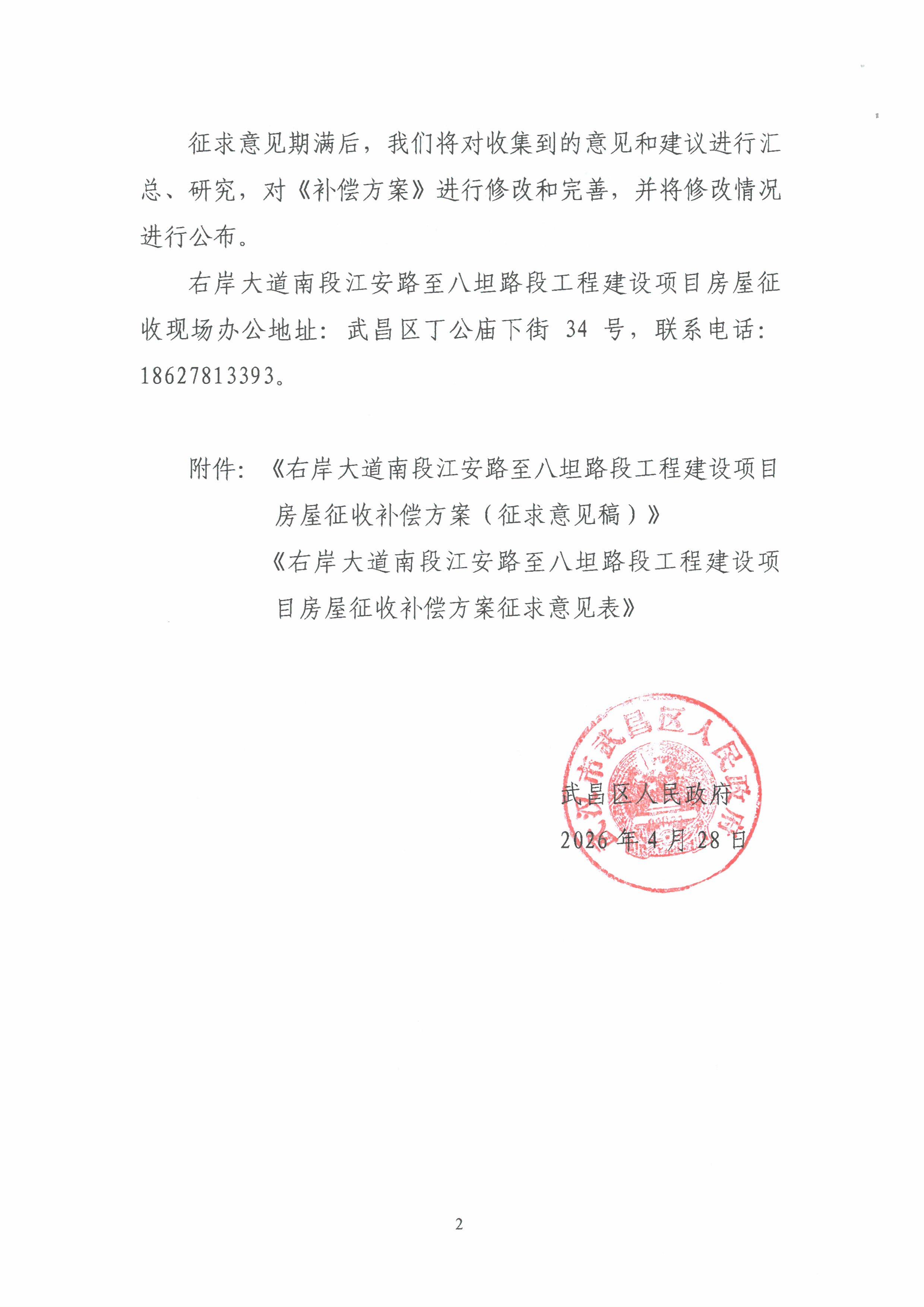 关于《右岸大道南段江安路至八坦路段工程建设项目房屋征收补偿方案(征求意见稿)》公开征求意见的公告