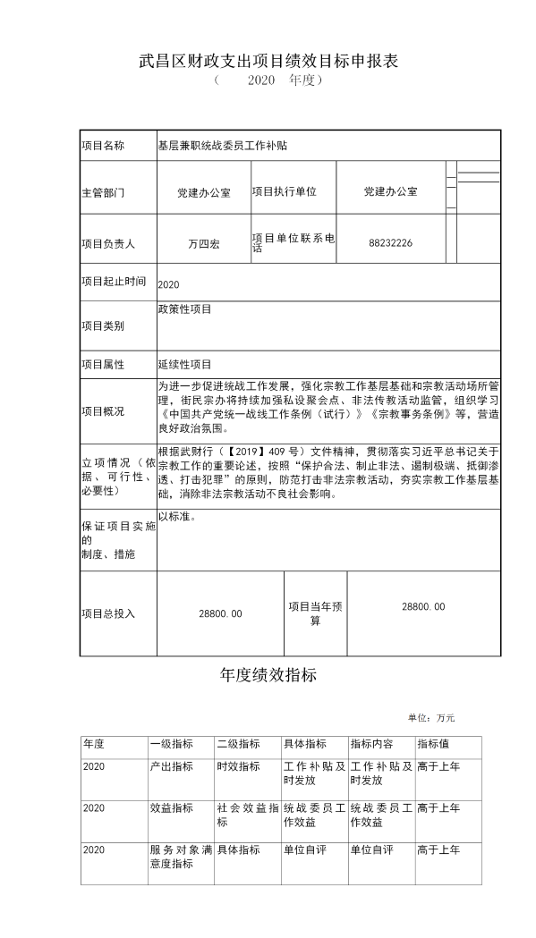 15.基层兼职统战委员工作补贴支出绩效目标表