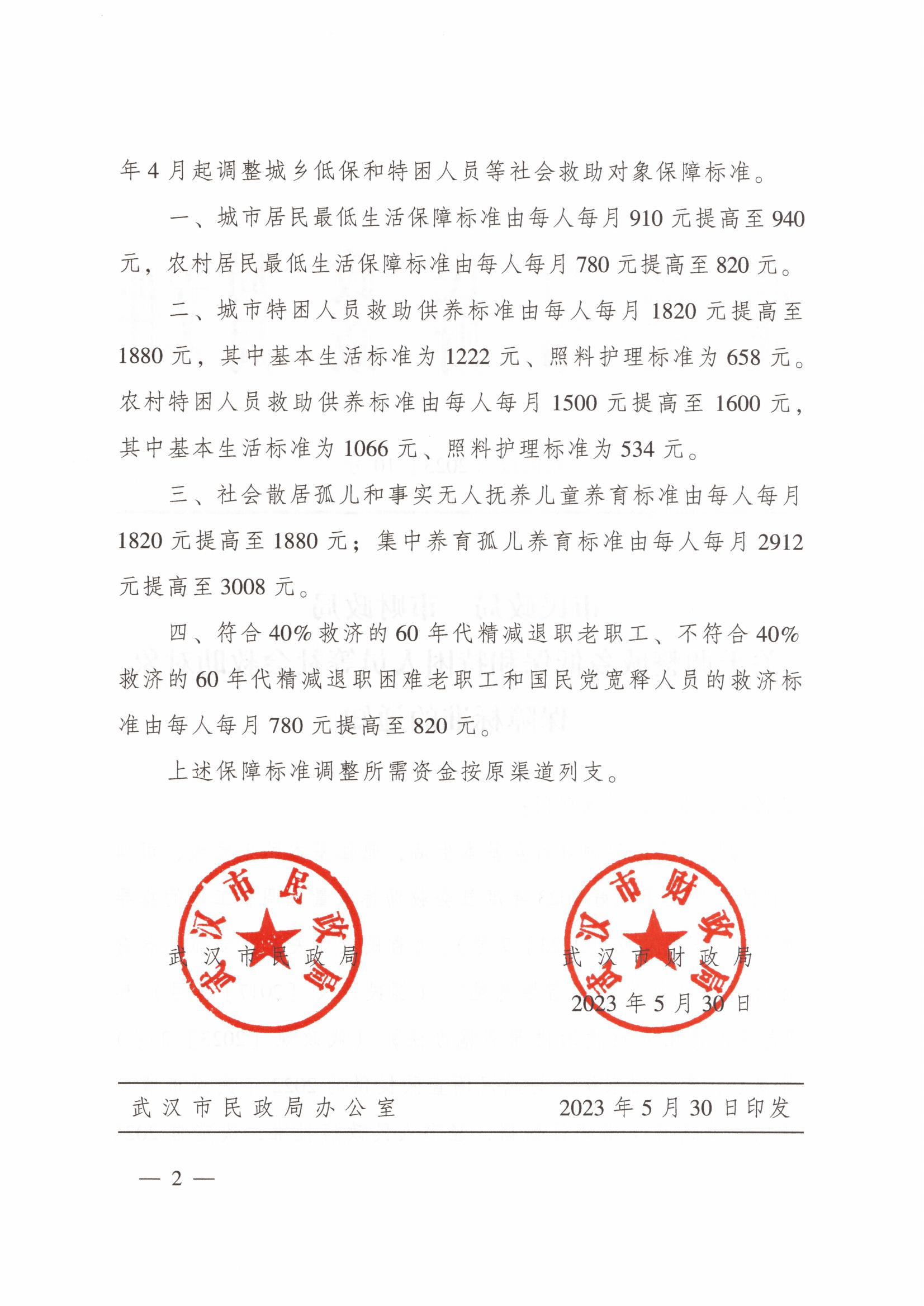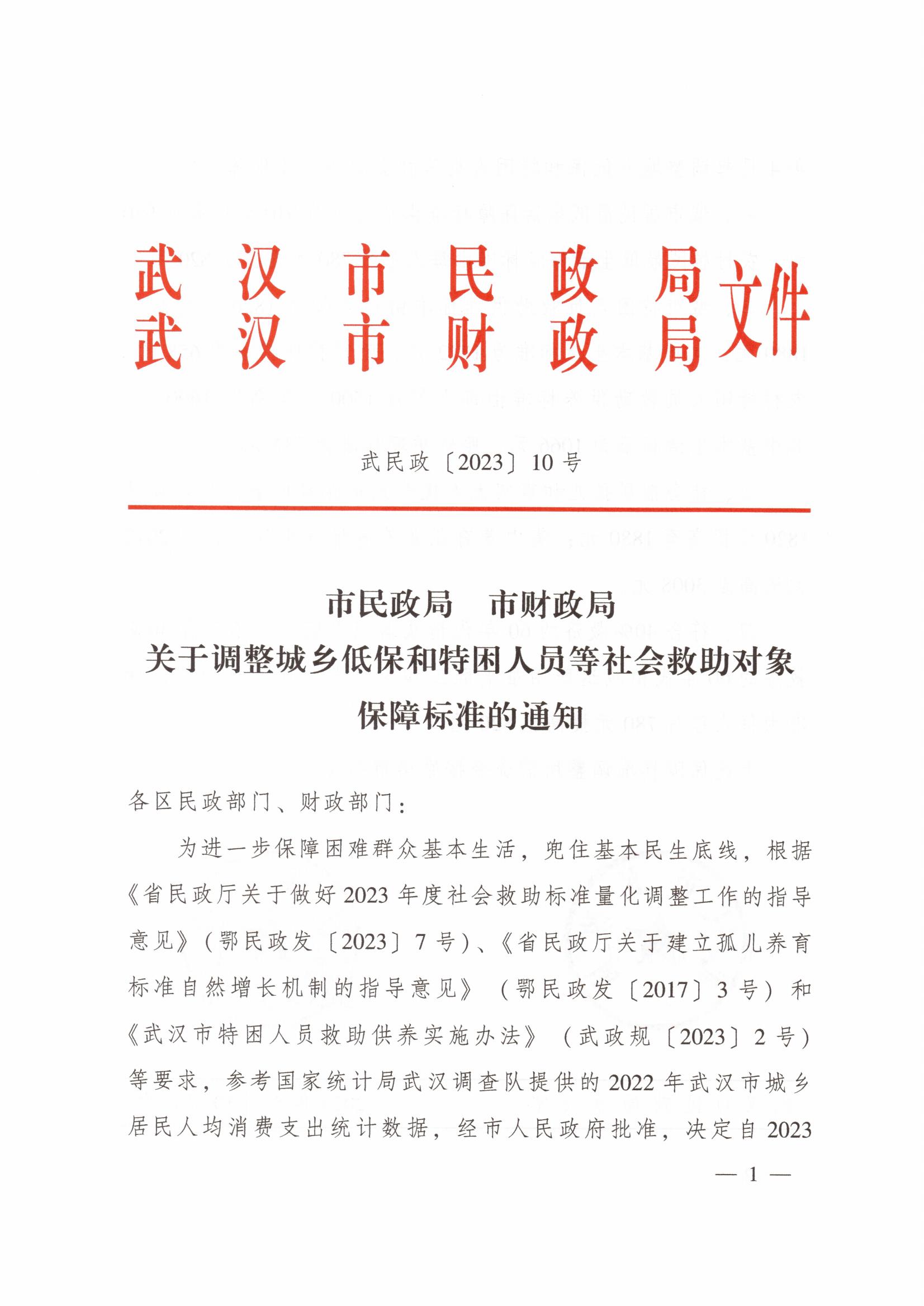 《市民政局 市财政局关于调整城乡低保和特困人员等社会救助对象保障标准的通知》(武民政〔2023〕10号)