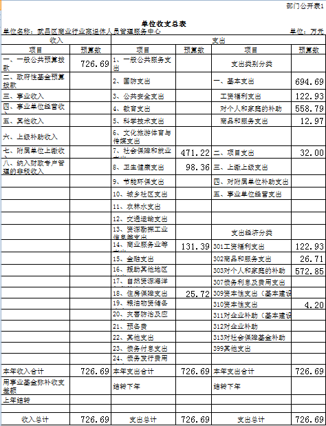 (一)2021年单位预算总收入726.69万元。其中:一般公共预算财政拨款收入726.69万元,其他收入0万元,上年结转0万元。比2020年预算减少19.69万元,下降1.03%,主要原因是人员经费离退休人员去世减少和项目经费压减8万元。