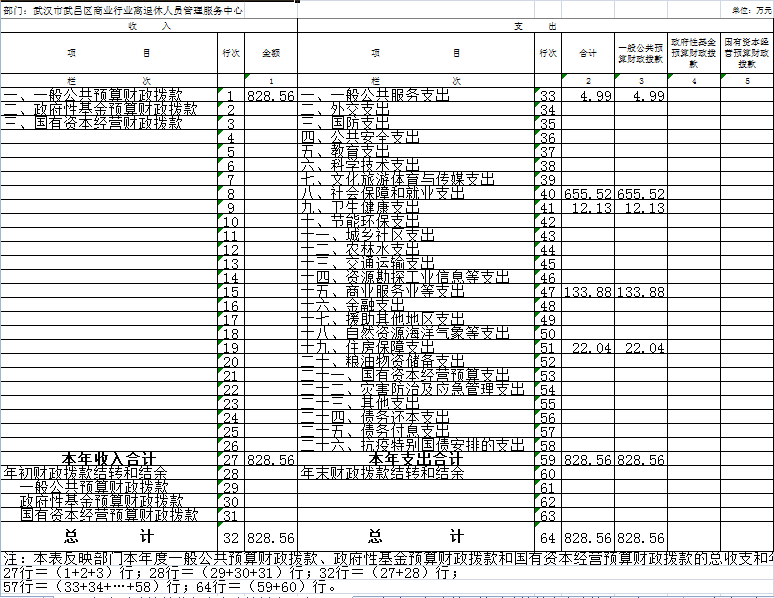 2020年度收、支总计828.56万元。与2019年度相比,收、支总计各减少81.52万元,下降8.96%,主要原因是2020年度离退休人员去世各1人,共2人。