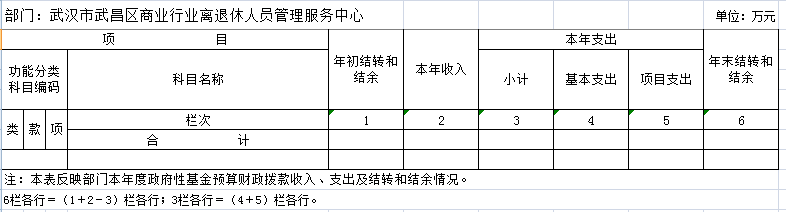 2020年度政府性基金预算财政拨款年初结转和结余无。武昌区商业行业离退休人员管理服务中心2020年度没有使用政府性基金预算财政拨款安排的支出。