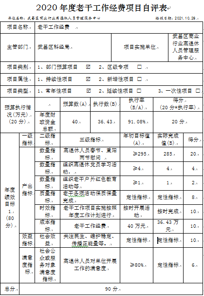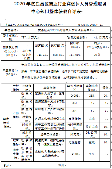 组织对本单位开展整体支出绩效自评,项目资金-老干工作经费总支出资金41.42万元,根据《武汉市市直预算绩效评价管理暂行办法》(武财绩〔2021〕546号)的格式要求,公开《2020年度武昌区商业行业离退休人员管理服务中心老干工作经费整体绩效自评表》