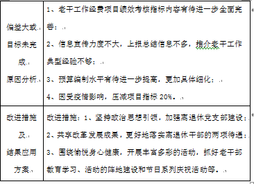 单位绩效评价结果应用情况。2020年单位完善老干工作经费项目的规划、落实各个绩效目标管理,健全制度管理、加强项目管理、结果与预算安排相结合,通过开展多种多样的活动,使得老干部对单位老干工作的满意度不断提高。
