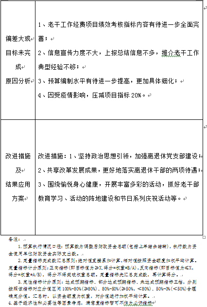 1.老干工作经费项目绩效自评综述:项目全年预算数为50万元,执行数为41.42万元,完成预算的82.84%。主要产出和效益是:一是本项目各活动都是在制定实施方案的基础上,开展重要时间节点走访座谈慰问,慰问人次285人;二是组织老干重阳张公山等户外参观学习活动1次,疫情期间,通过微信、电话逐个询问他们身体状况和生活近况等,在思想上为老干部排忧解难,及时宣传党中央的指示精神决策部署,叮嘱他们遵守疫情防控的相关规定,提示大家不串门、居家修养,宅在家也是对抗疫情作出最大贡献。本项目整体完成顺利,成效明显,老干部对单位开展和服务质量都很满意。发现的问题及原因:一是项目指标绩效考核内容有待进一步完善;二是老干宣传信息力度不大,上报时间信息量不多,推广老干工作典型经验不够;三是预决算编制进一步细化。下一步改进措施:一是坚持思想引领,加强离退休干部党支部建设;二是共享改革发展成果,落实完善好离退休干部政策、生活两个待遇,三是围绕愉悦身心,更好地开展丰富多彩的活动,抓好老干部学习和活动阵地建设。
