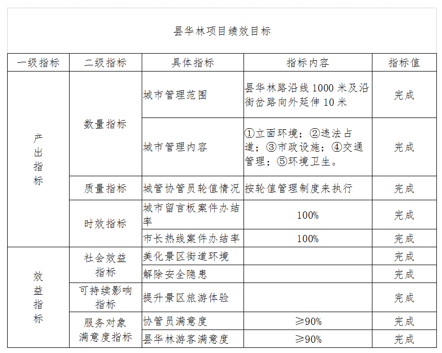 城市综合管理工作(昙华林专项)项目绩效自评综述:本项目全年预算为100万元,执行数为100万元,完成预算的100%。本项目用于昙华林管委会日常办公及街区的文化活动以及基础设施的建设与维修。主要产出:一是昙华林路沿线1000米及沿街岔路向外延伸10米的立面环境、违法占道、市政设施、交通管理、环境卫生;二是城管协管员轮值情况;三是城市留言板案件办结率;四是市长热线案件办结率。