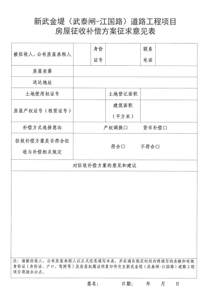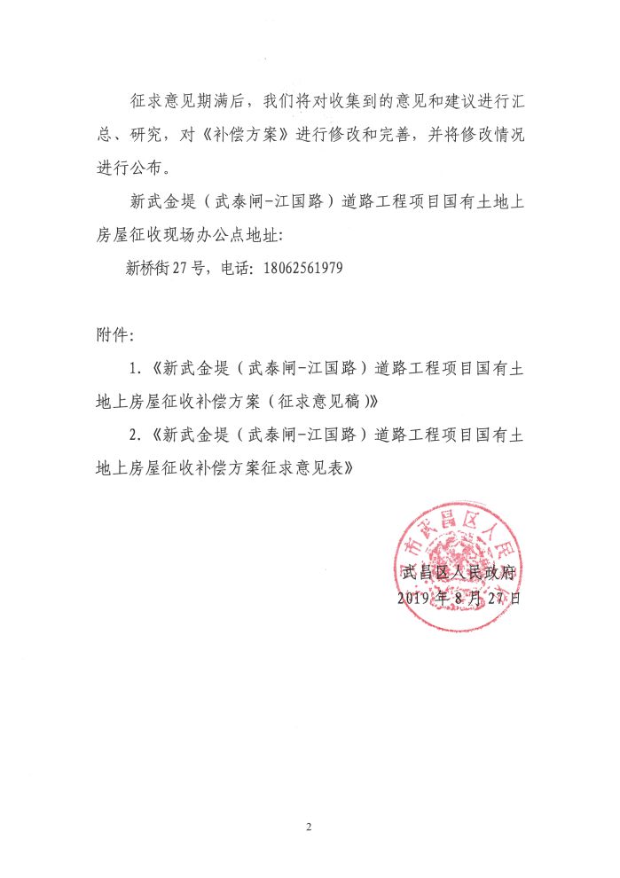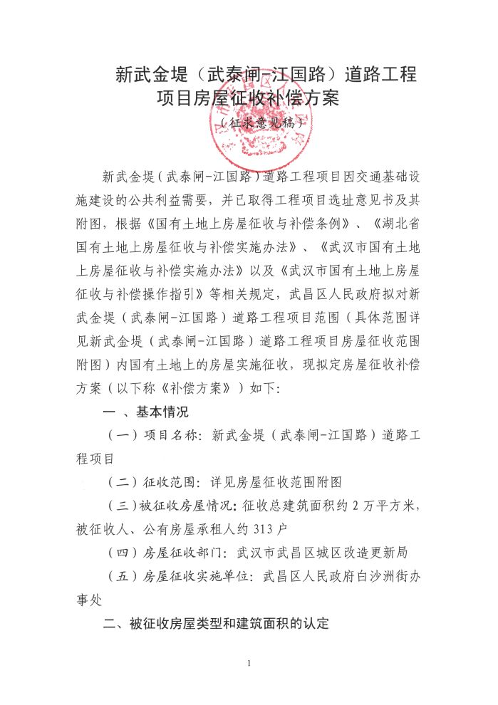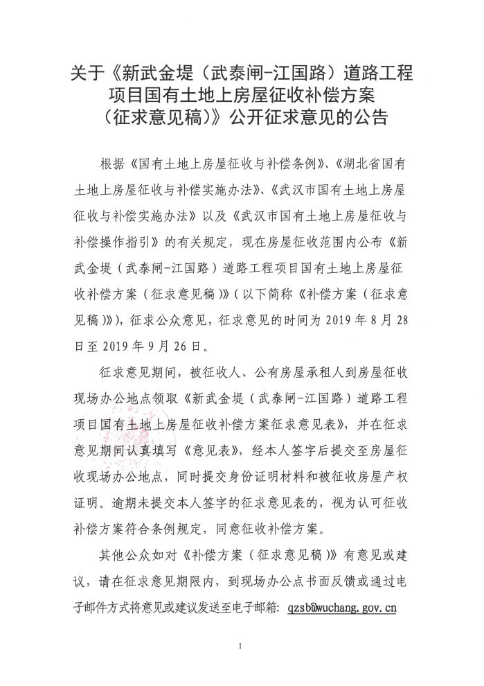 关于《新武金堤(武泰闸-江国路)道路工程项目国有土地上房屋征收补偿方案(征求意见稿)》公开征求意见的公告