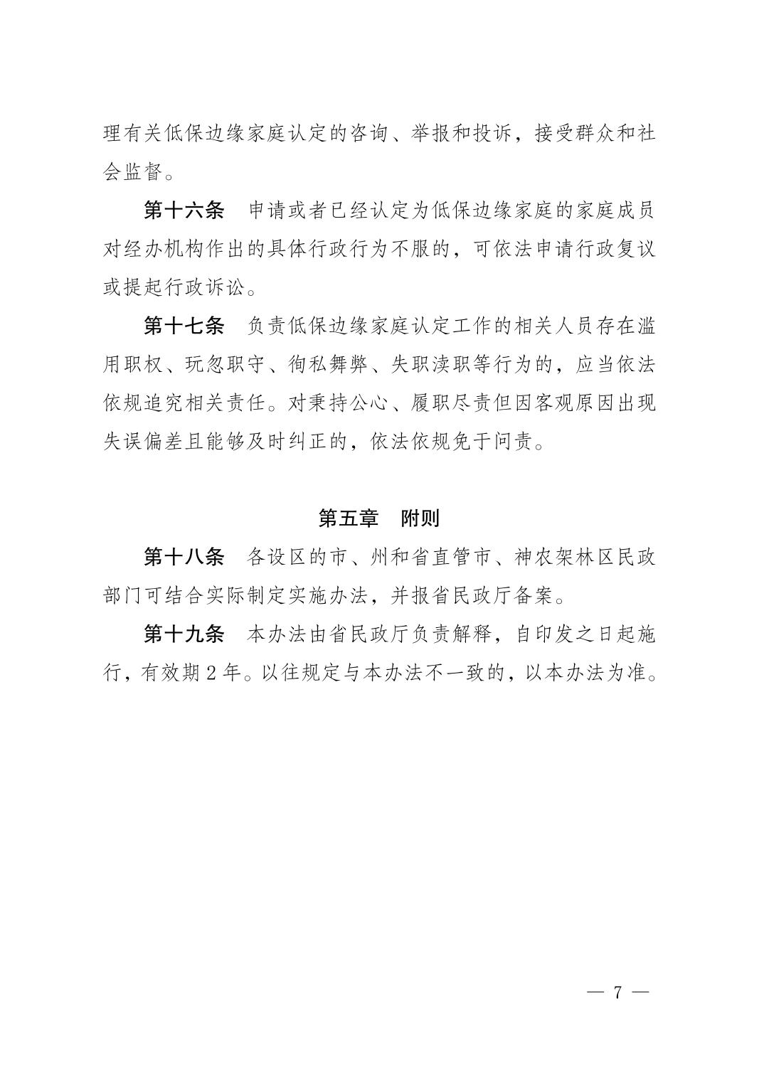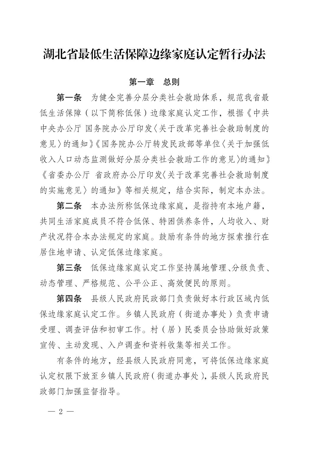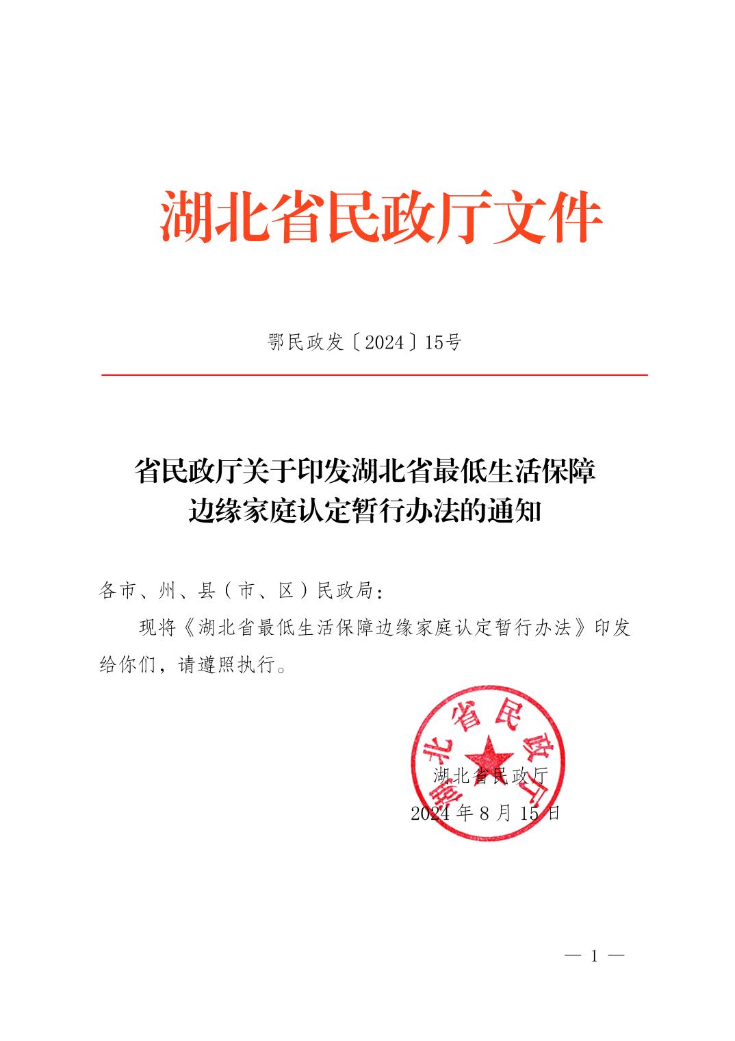 省民政厅关于印发湖北省最低生活保障边缘家庭认定暂行办法的通知(鄂民政发〔2024〕15号 )